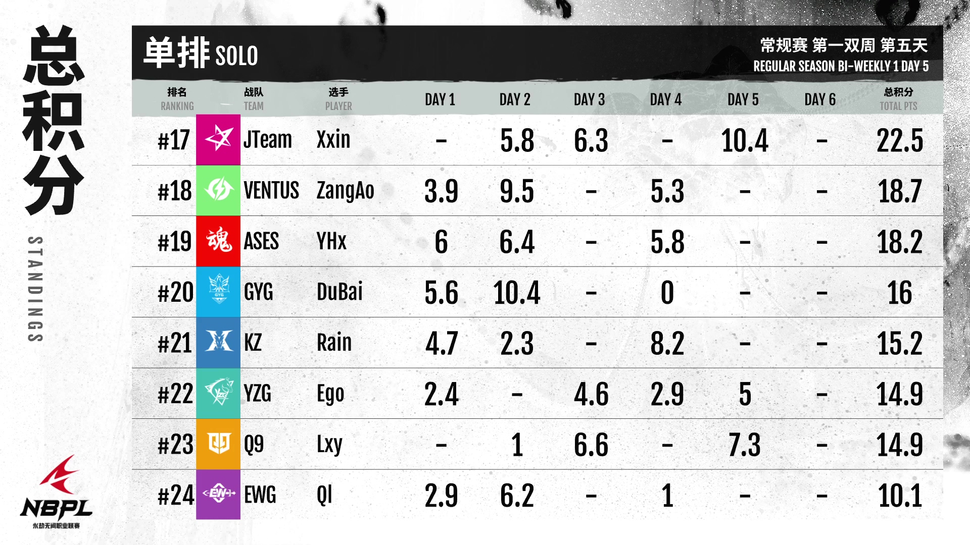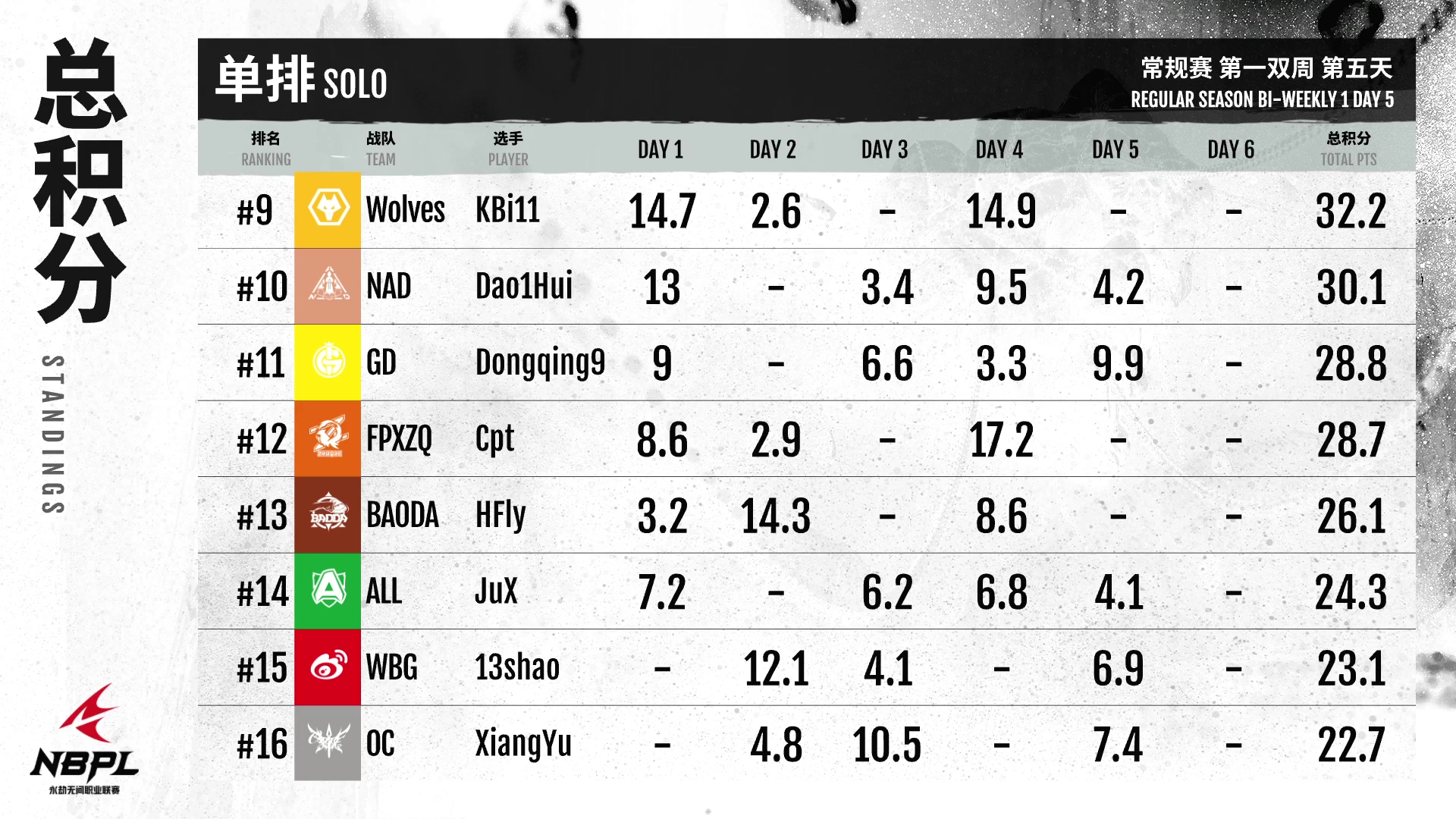 6月9日,《永劫无间》NBPL职业联赛将迎来第五天的比赛,B/C两组展开角逐,气氛紧张,蓄势待发!单打前三名仍然是GG队的沙、队的饿和XSG队的向。但是,这三位今天表现不佳。来自OUG队的鲁仁京获得了单日最高分20.3分,但与第一小组仍有较大差距。希望以后能有更好的表现。