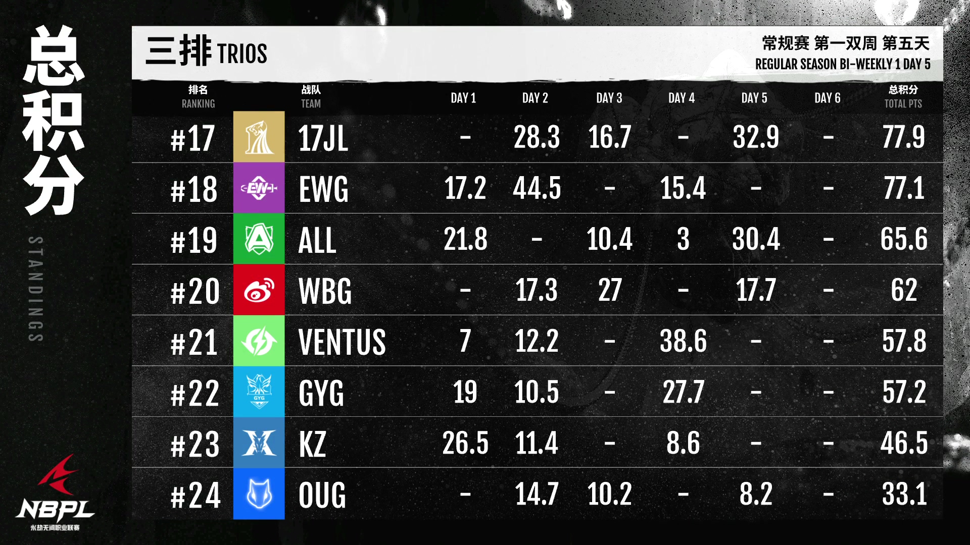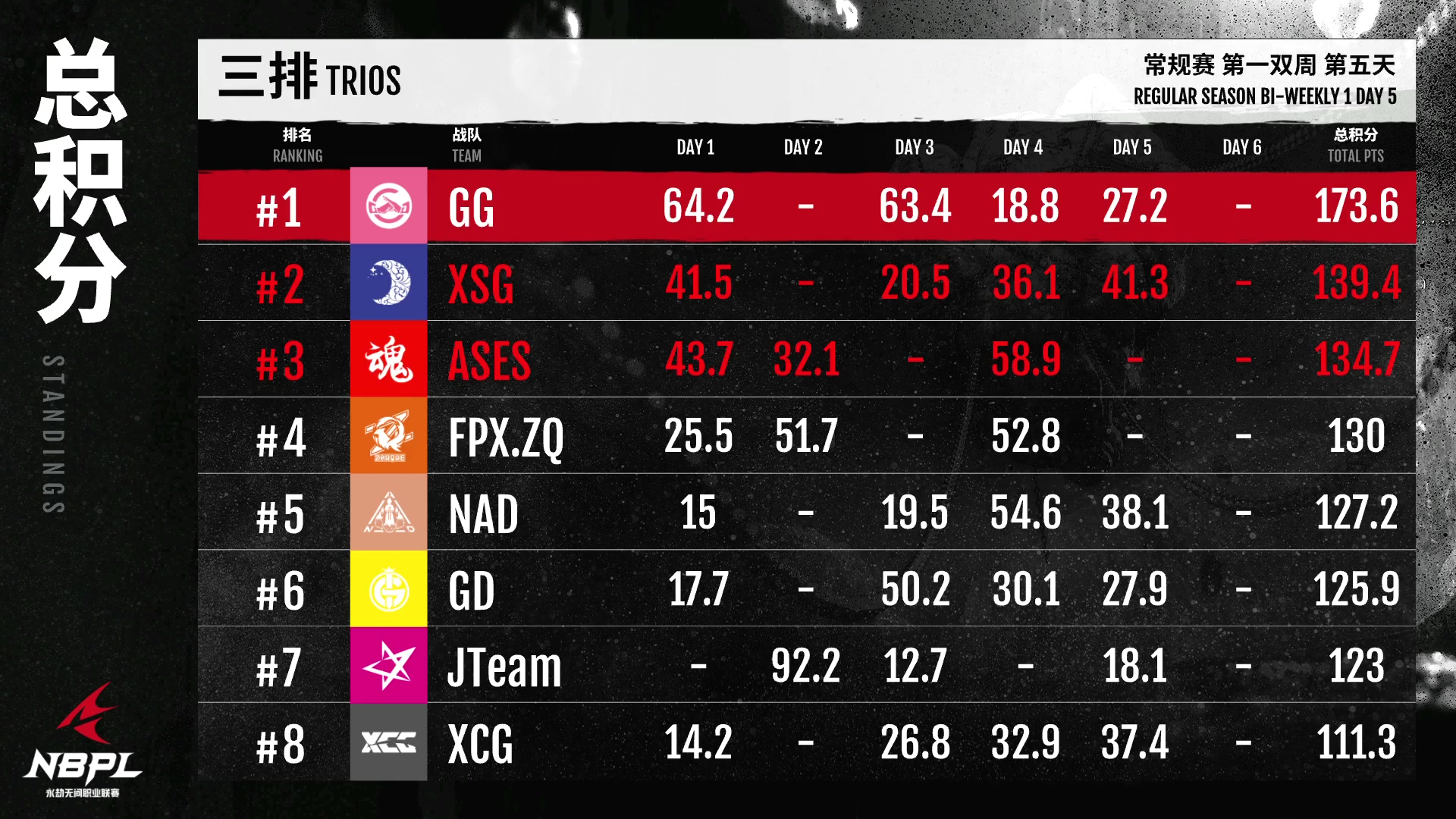 三人赛中,已经完成全部比赛的GG战队以173.6分领先,XSG以139.4分排名第二,但也完成了全部比赛,所以第二名并不稳固。ASES和FPX。少赛一场的ZQ队排名第三或第四,希望在最后一天有更好的表现。明天的决赛将决出周总决赛的队伍,关注比赛,一起见证日选时刻!