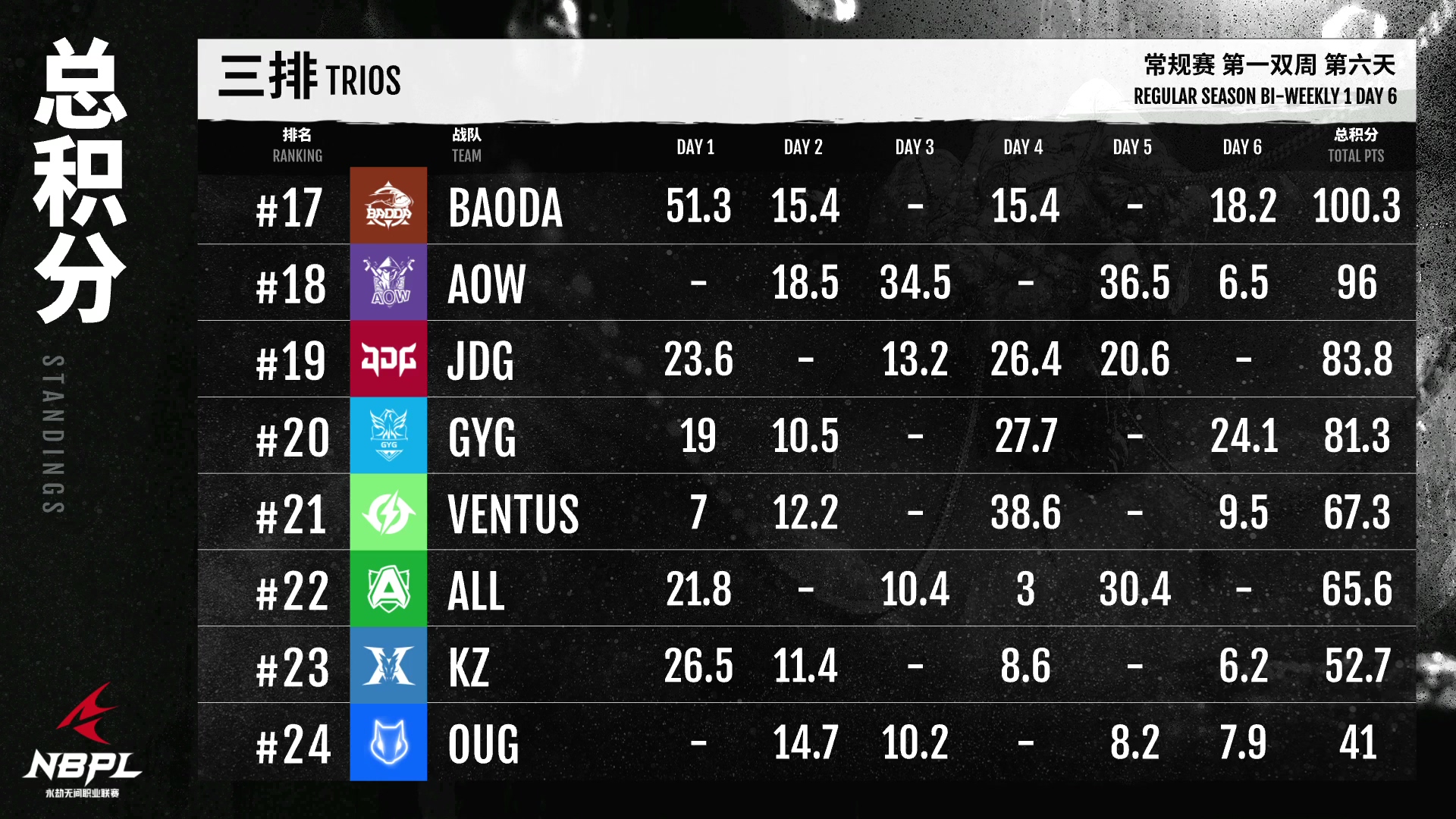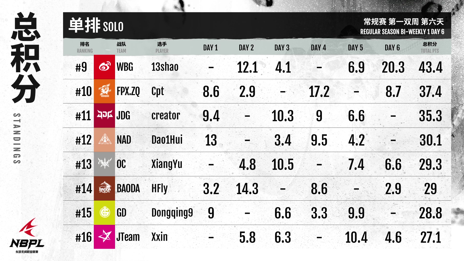 6月10日,《永劫无间》NBPL职业联赛将迎来前两周的最后一天。AOW队的Mike在最后一天成功超越GG队的SHA登顶单排榜,队的LuRenKing在最后两天表现出色,获得第三名。