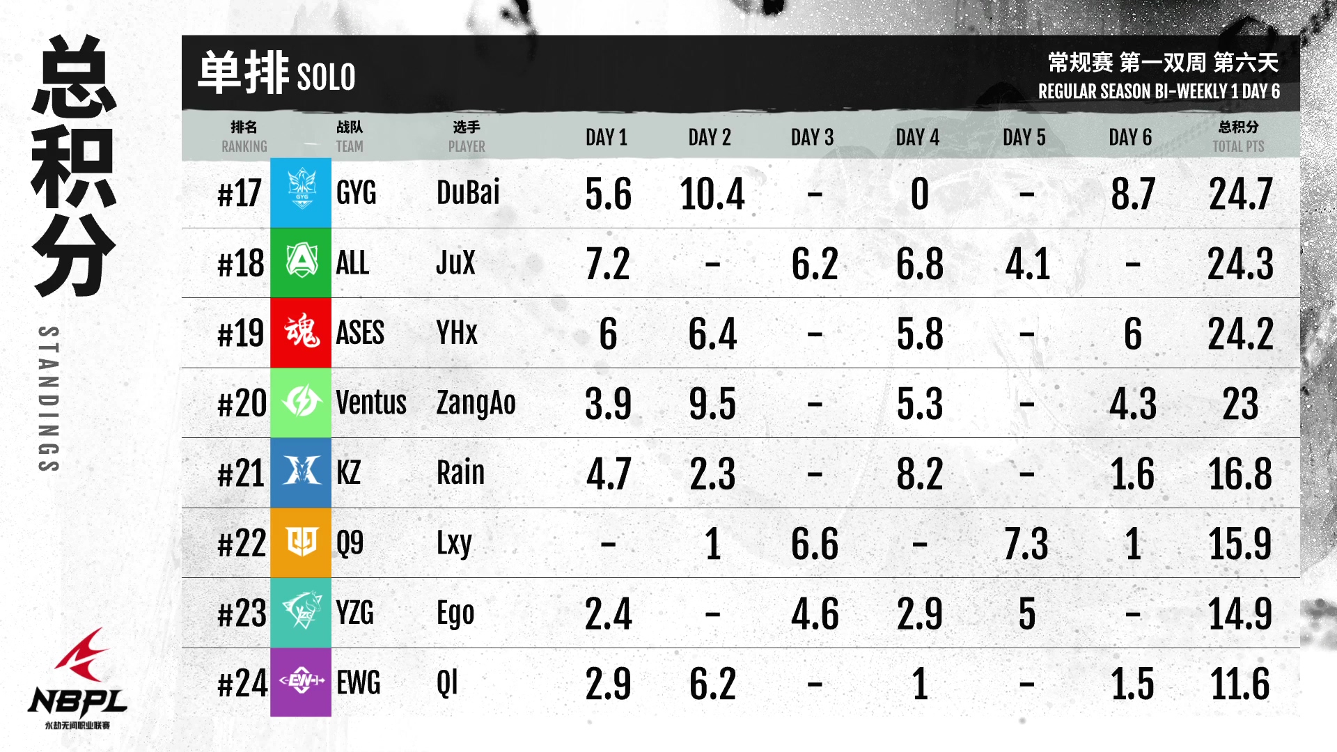 第三排,GG战队拔得头筹,ASES获得第二名,WBG在最后一天打出97.4分,一举跃升至第三名。Q9在最后一局成功超越自我,16人晋级。