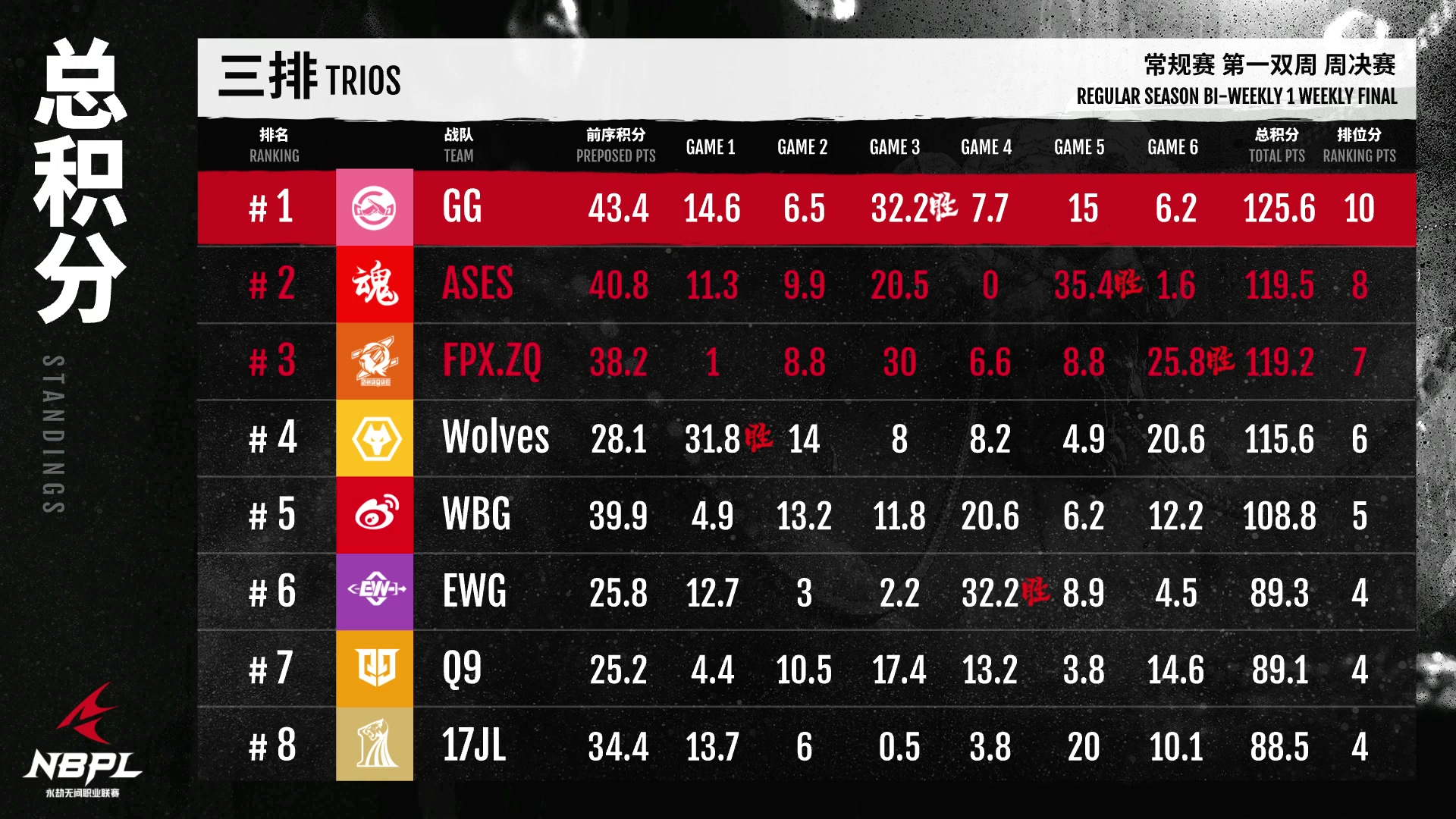 恭喜所有获得周总决赛排名积分的选手,期待他们有更好的表现。