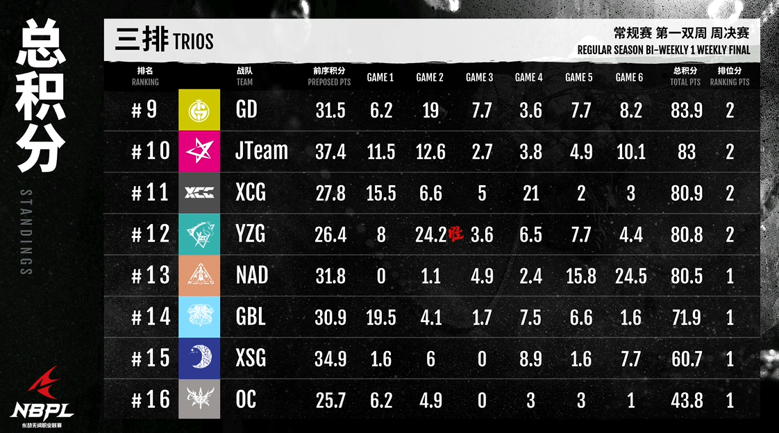 《永劫无间》职业联赛NBPL常规赛6月12日结束了前两周的全部比赛,GG队获得三排周冠军!互相配合,让我们期待他们下周更精彩的表现吧~