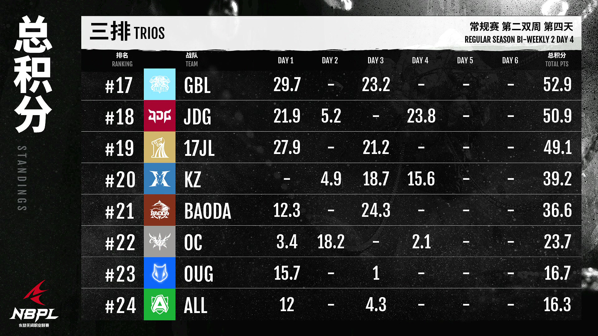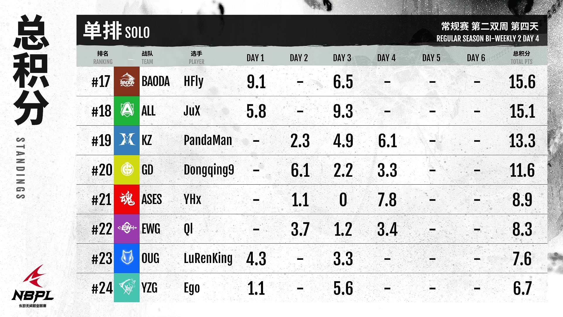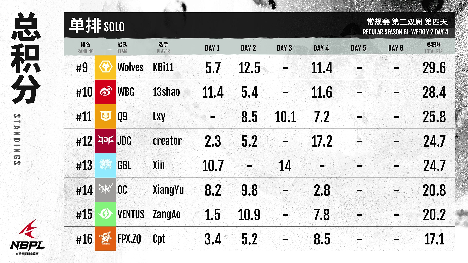 6月19日,《永劫无间》职业联赛NBPL常规赛迎来了第二周的第四天。AOW,迈克,两天的成绩名列榜首!天人第一的含金量!xcü王良今天两场比赛遭遇滑铁卢,但单杆成绩依然名列前茅!JTeamXxin今天终于拿下了单场最高分。他打得很有侵略性,向大师们学得更多!