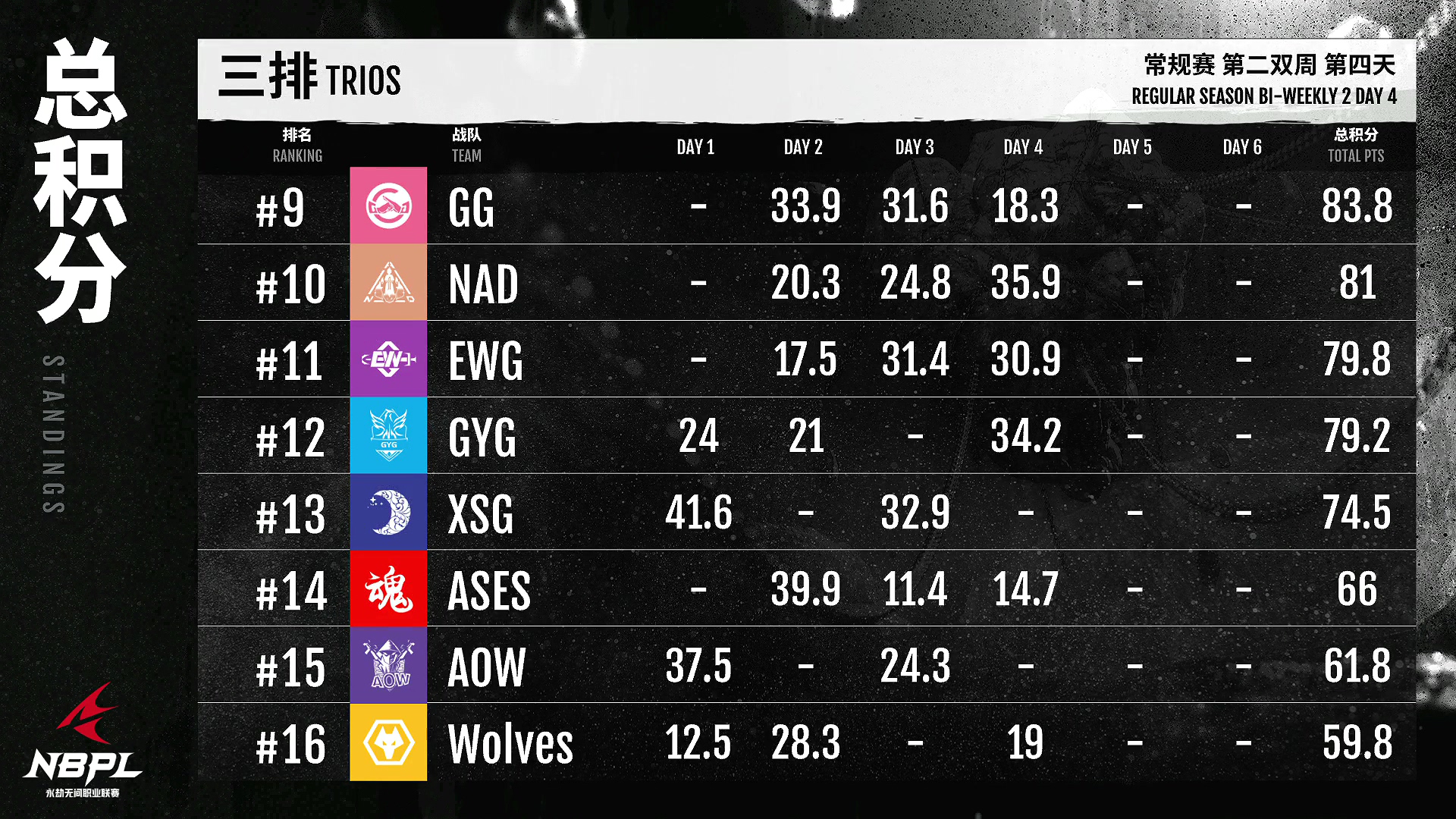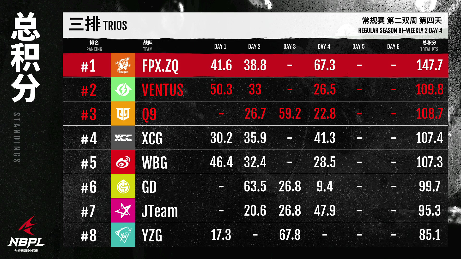 在三人比赛中,FPX。ZQ今天在凤凰城醒来!成功调整状态后,在总决赛中发挥主导作用!文图斯保持了稳定的双变阵容,暂时占据了积分榜第二的位置!Q9越打越勇敢。今天,你在积分榜上排名第三。让我们期待他们下周的精彩表现吧!