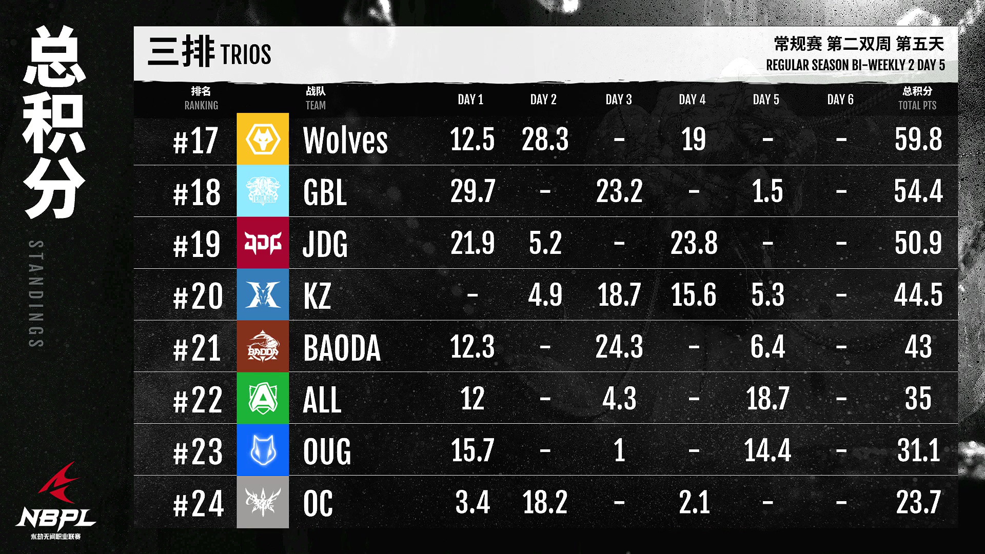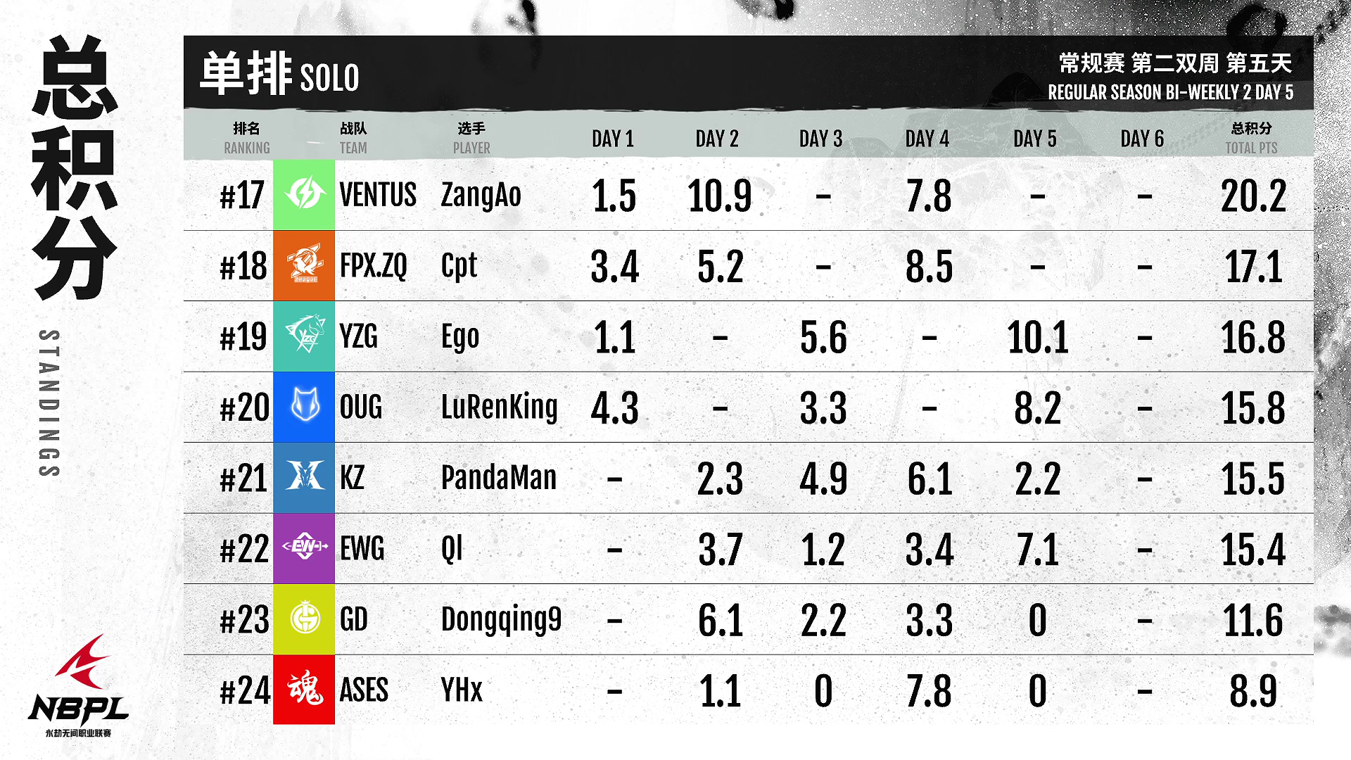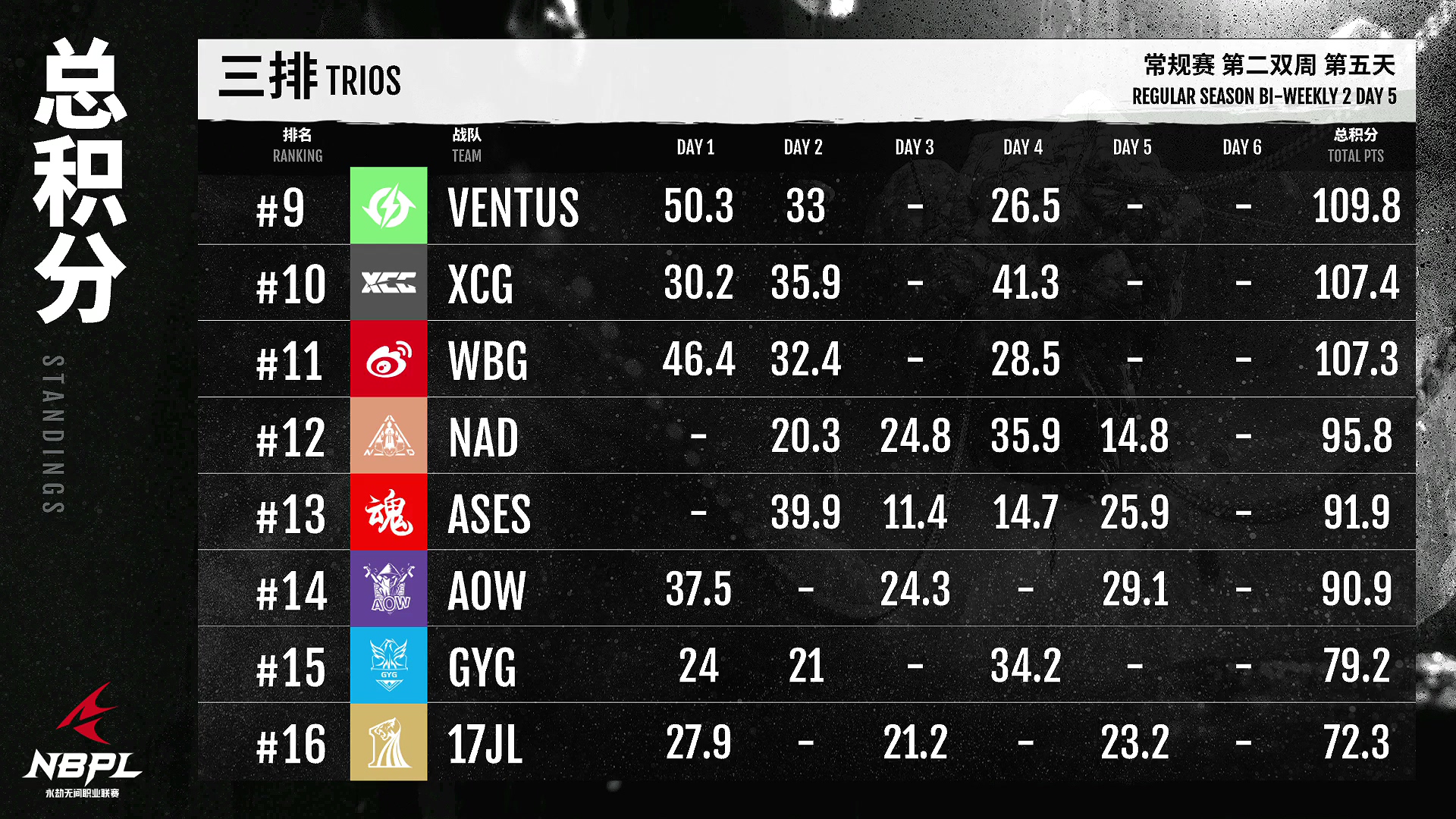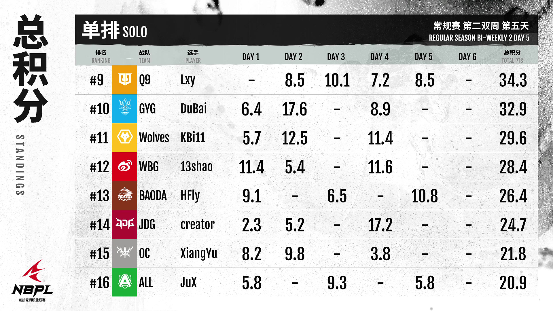九青队今天连续两场单场第一!雕强高效,整体状态有目共睹!FPX。朱雀队明天比赛。面对积分差距,朱雀有很大机会追上第一名!GD今天表现依然稳定,在积分榜上名列前茅,保证晋级周中决赛!