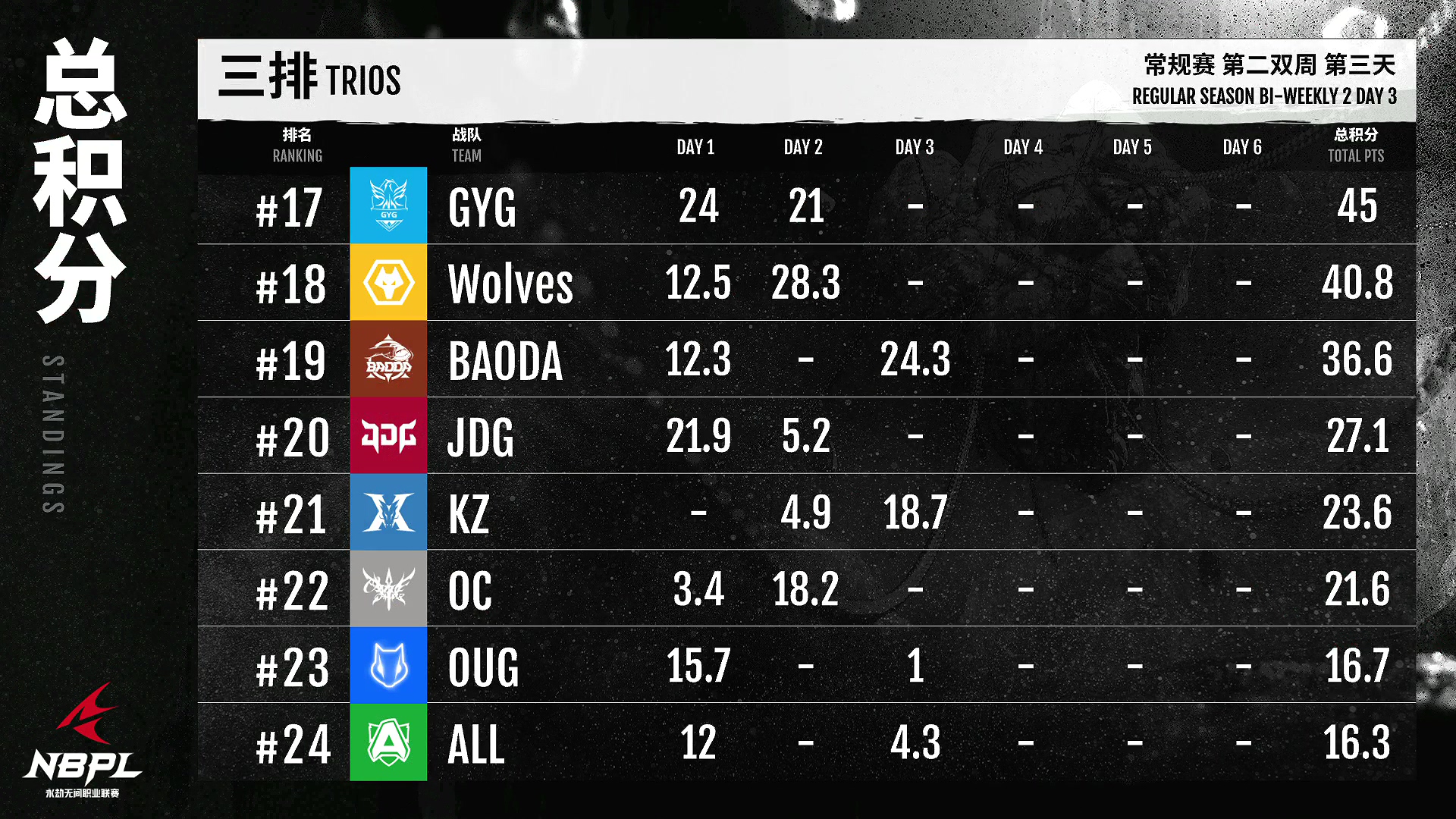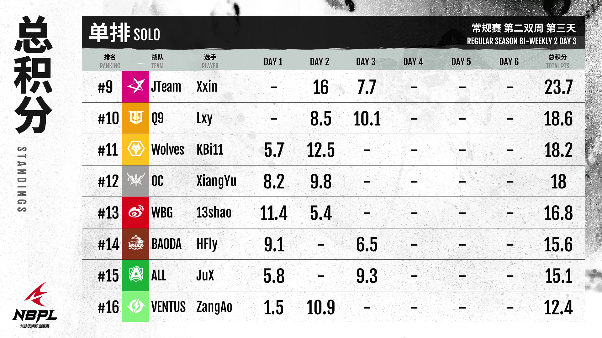 九青队今天连续两场单场第一!雕强高效,整体状态有目共睹!FPX。朱雀队明天比赛。面对积分差距,朱雀有很大机会追上第一名!GD今天表现依然稳定,在积分榜上名列前茅,保证晋级周中决赛!