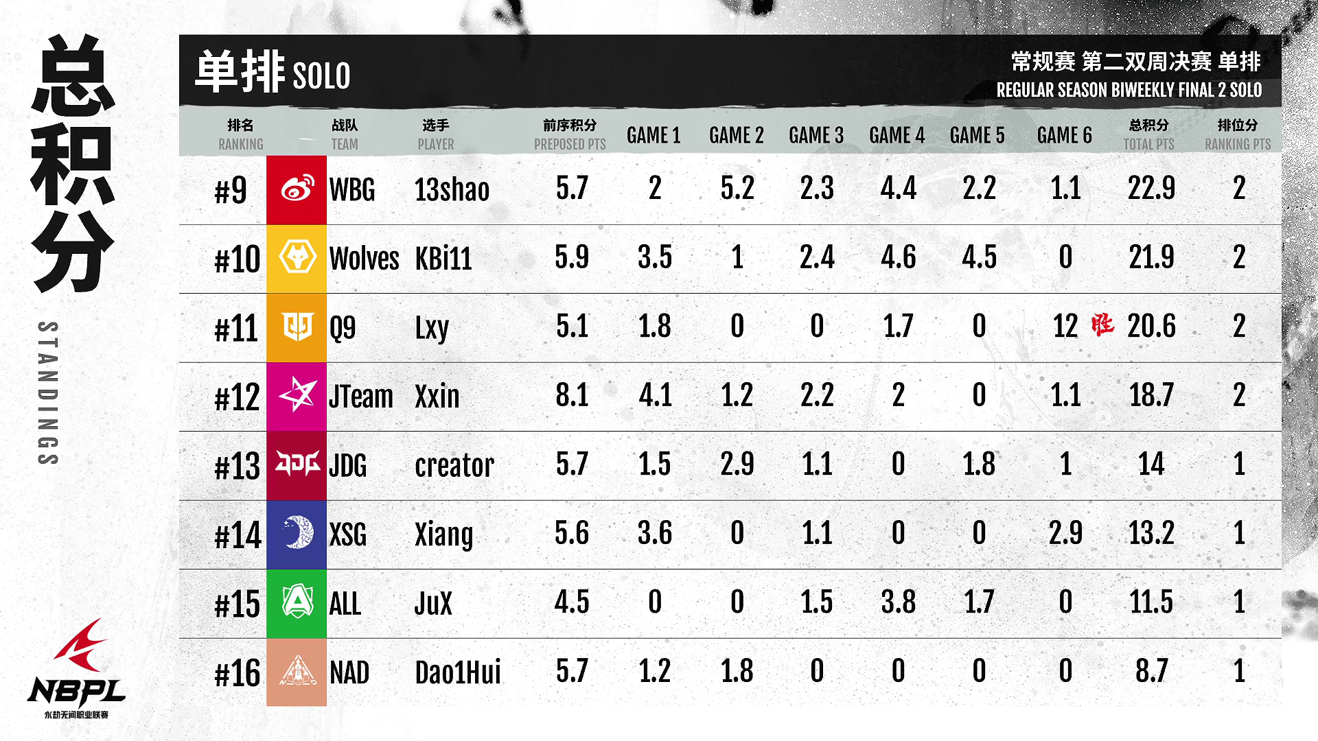 《永劫无间》职业联赛NBPL常规赛第二届双周单排周决赛正式拉开帷幕。祝贺GYG·迪拜获得三场比赛的最高分,实现了他赢得每周冠军的愿望!极限差完成超车,成绩说明一切证明自己!17JLAS依旧发挥稳定,可惜最后独角戏险胜。我相信AS会带来更精彩的表演!AOW·迈克敢于在最终得分后战斗和战斗,这一周向我们展示了他的侵略性打法和操作头脑并存。让我们期待迈克的下一场比赛吧!恭喜独白再次卫冕第二届双周单排决赛冠军!