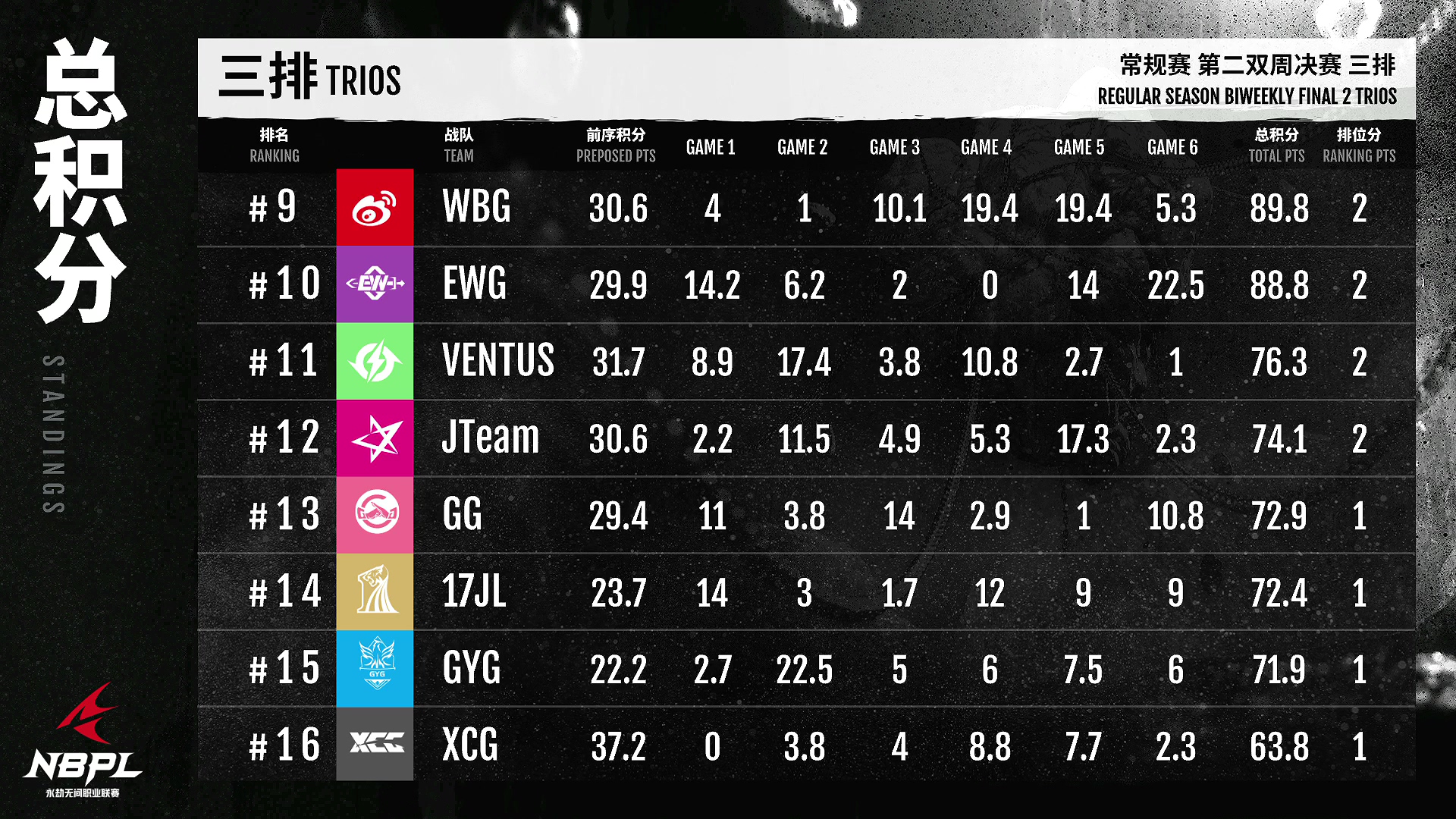 《永劫无间》职业联赛NBPL常规赛第二周全部比赛正式落下帷幕。在今天的三排赛中,恭喜XSG成功获得第二届双周赛冠军。从成绩落后到奋起直追,他们的状态一路飙升,今晚他们燃起了燎原之火,聚集在了库州!YZG今天在追分中发挥稳定强劲,在收官战中获得了不少积分。让我们期待他们接下来的精彩表现吧!作为巨库洲公认的领军团队,GD在今天赛程的前半段发挥显著。我相信他们有更高的极限!