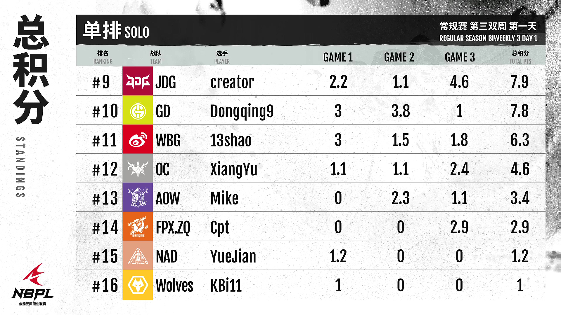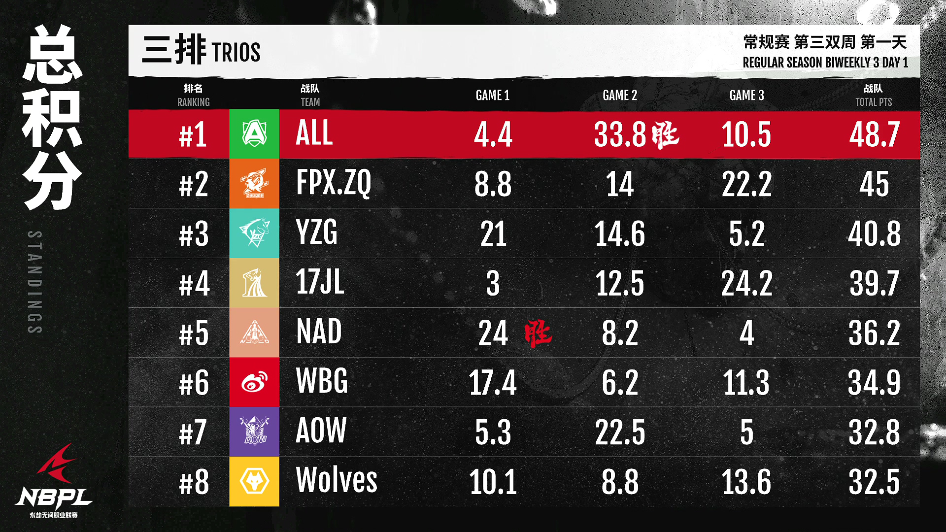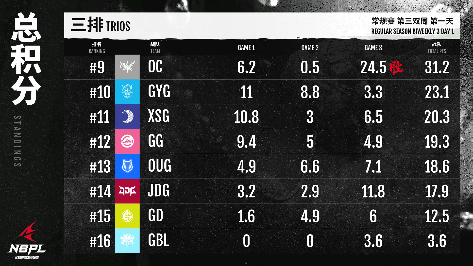 第三排第一名是联盟电竞俱乐部!A队努力成长,进步神速!本周开了个好头!FPX。朱雀保持着他们稳健的势头,第三局尤为亮眼。目前,排名第三!YZG战队今天前两场的精彩表现已经让他们名列前茅,期待接下来更多精彩表现~