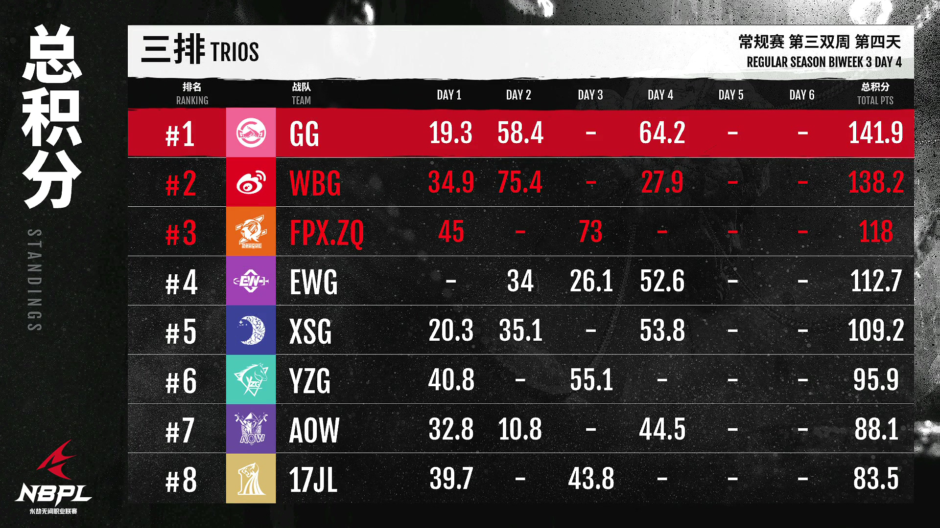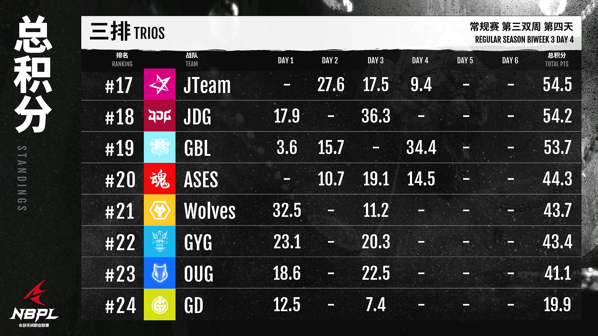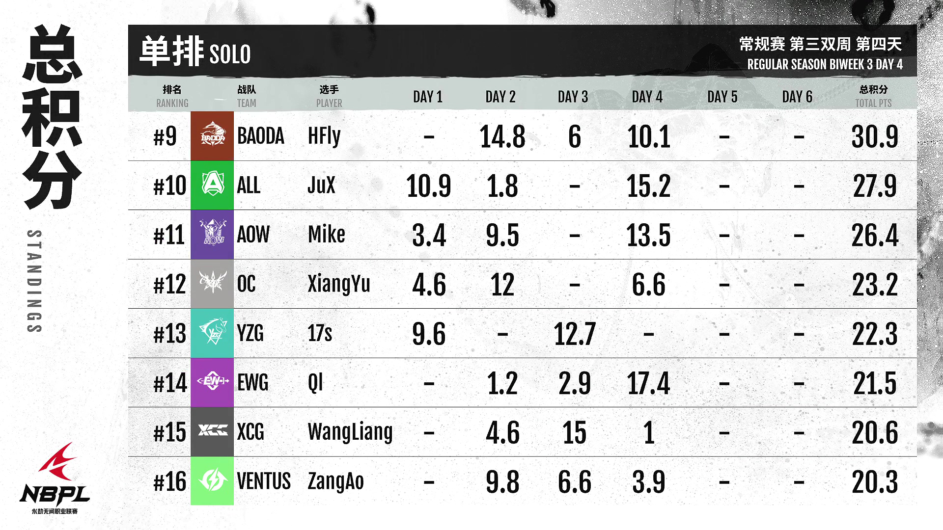 《永劫无间》职业联赛NBPL将迎来第三场双周对抗赛DAY4,今天将由B/C两个小组展开争夺。排行榜第一名GBL·肖鑫闷声发大财!虽然没有拿到很高的单场成绩,但是稳定的成绩让他获得了目前的头名!熊猫人,KZ,在今天的济沧海中获得单场最高分,重振雄风!微小的点领先于独白!gy独白以两天积分位列积分榜前三,可见其含金量!