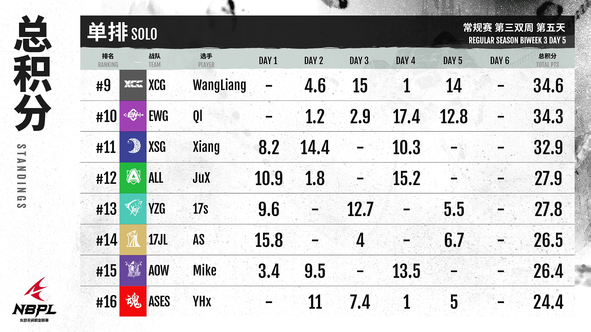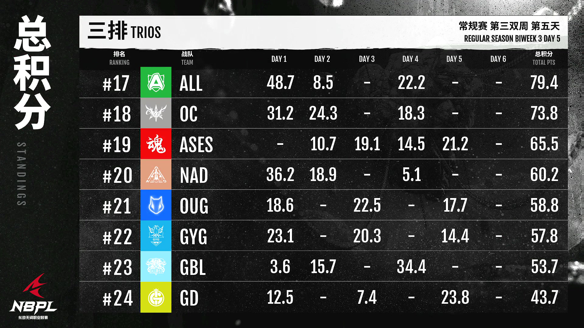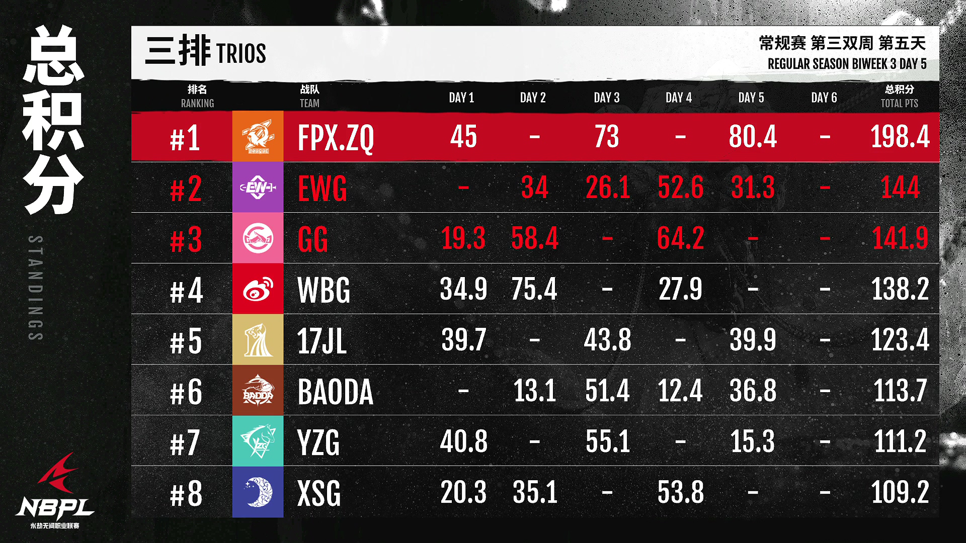 在第三排,FPX朱雀队发挥出色!仅仅三天比赛,成绩将近200%,势头凶猛!EW战队发挥比较稳定,延续了不错的状态成绩,周总决赛门票稳稳获得!GG队需要期待明天的对决。他们能否扮演更出彩的角色,挑战FPXZQ的统治力?一起见证!