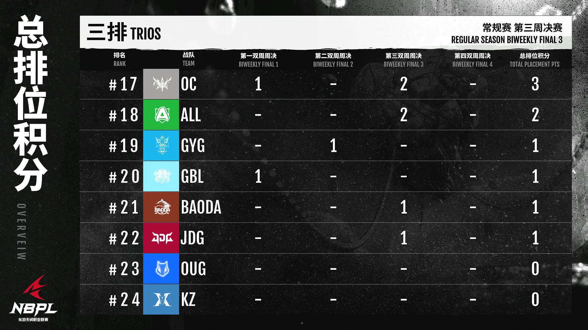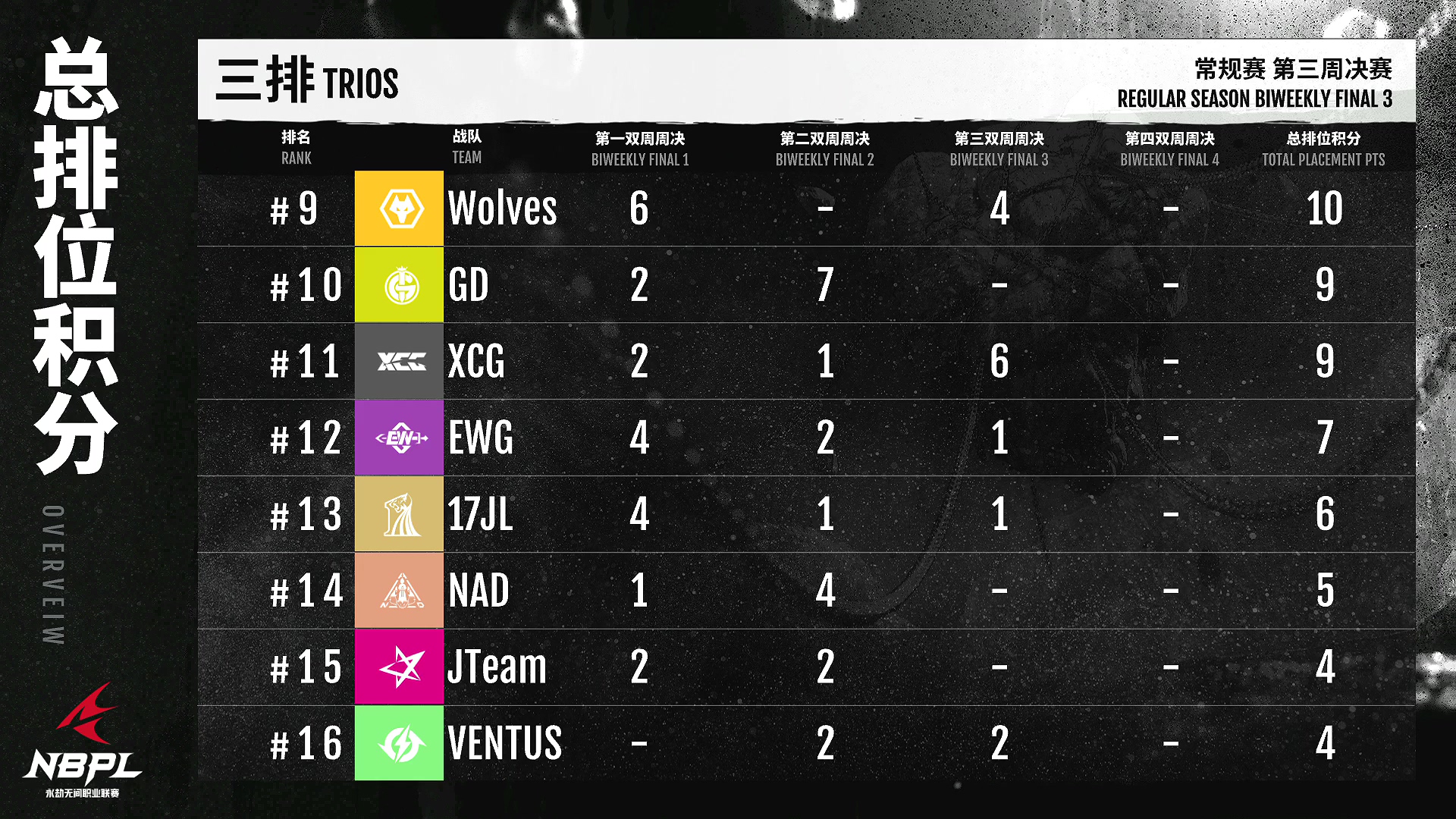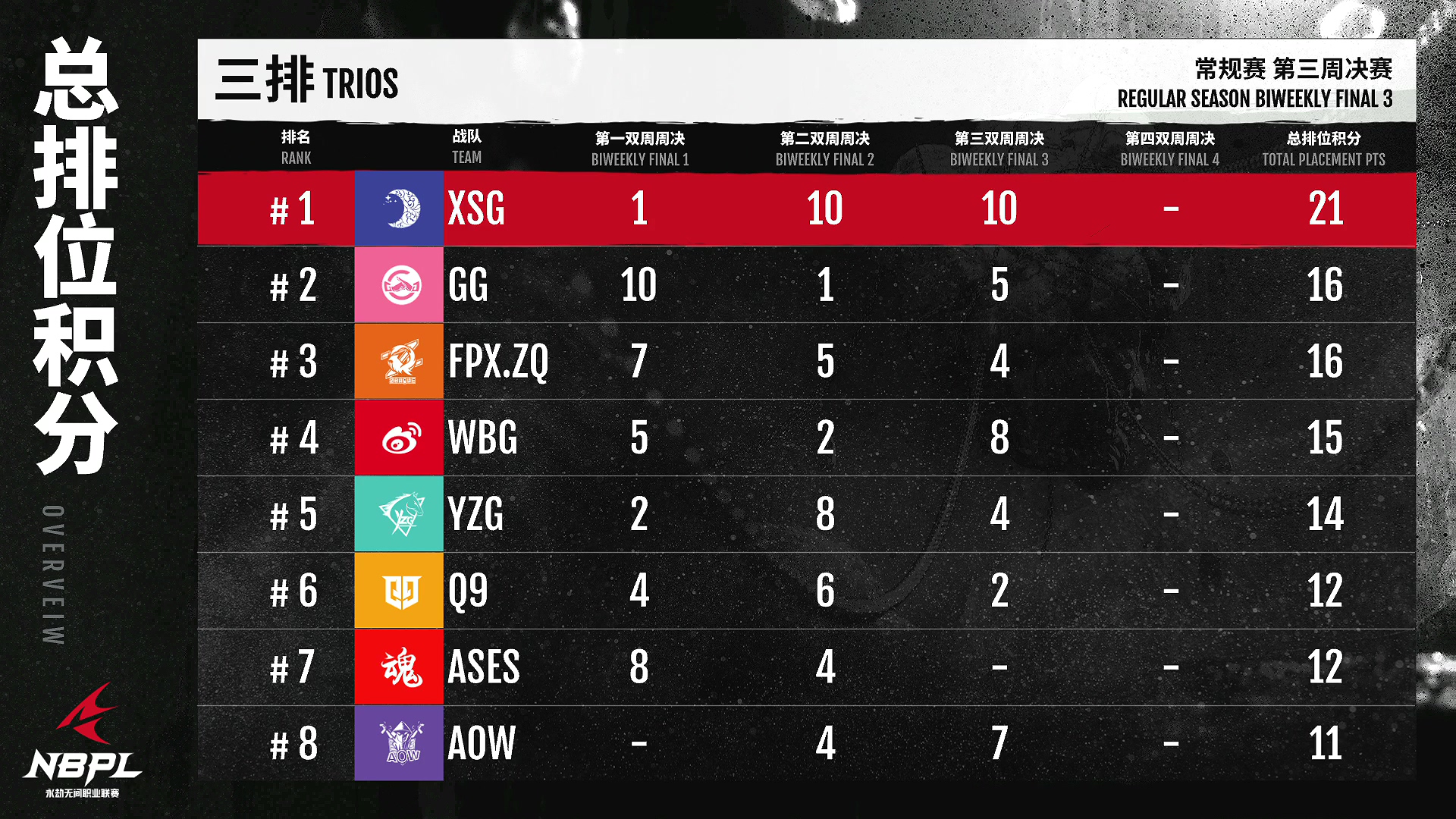 7月10日《永劫无间》职业联赛NBPL将进行三排周决赛!XSG凭借惊人的配合和韧性,第五场拿下40分,扶摇直上,星星之火可以燎原!打击场上所有的队伍!微博的队伍带来了非常不错的预订单积分,可惜第一场0分的滑铁卢可能会导致整体表现不那么稳定。相信他们会有更好的表现!虽然AOW没有带来很高的预赛分数,但它在第一场和最后一场比赛中的出色表现不得不令人称道!利用好冷门阵容,这支队伍在巨库洲让人惊喜又强大!
