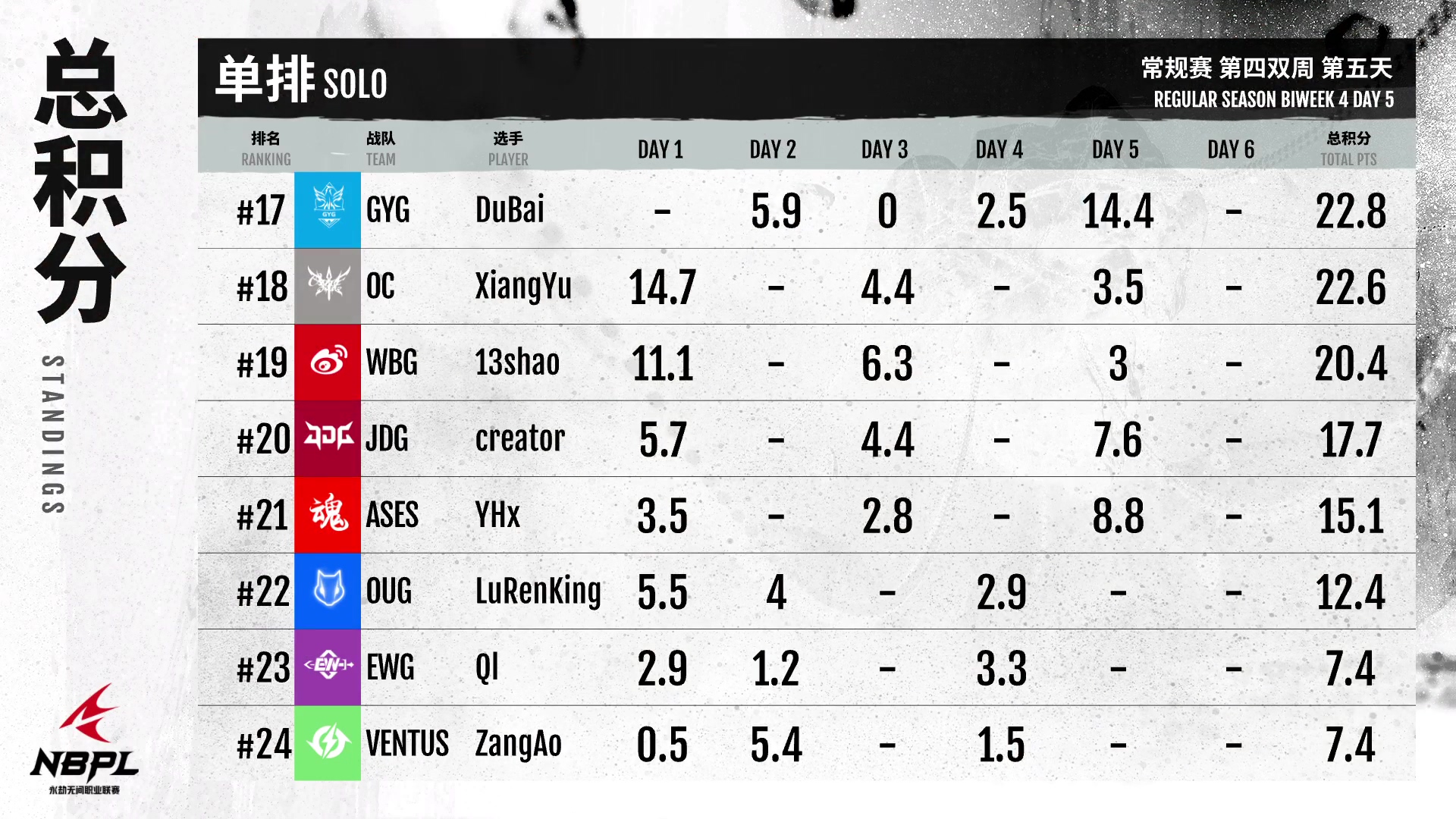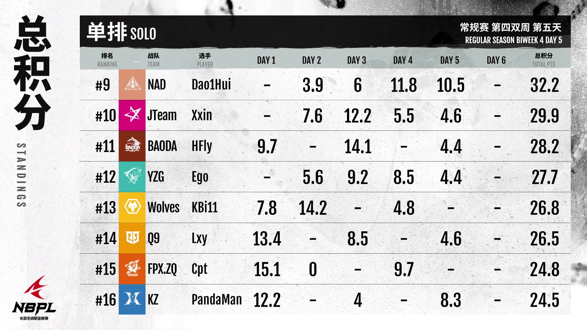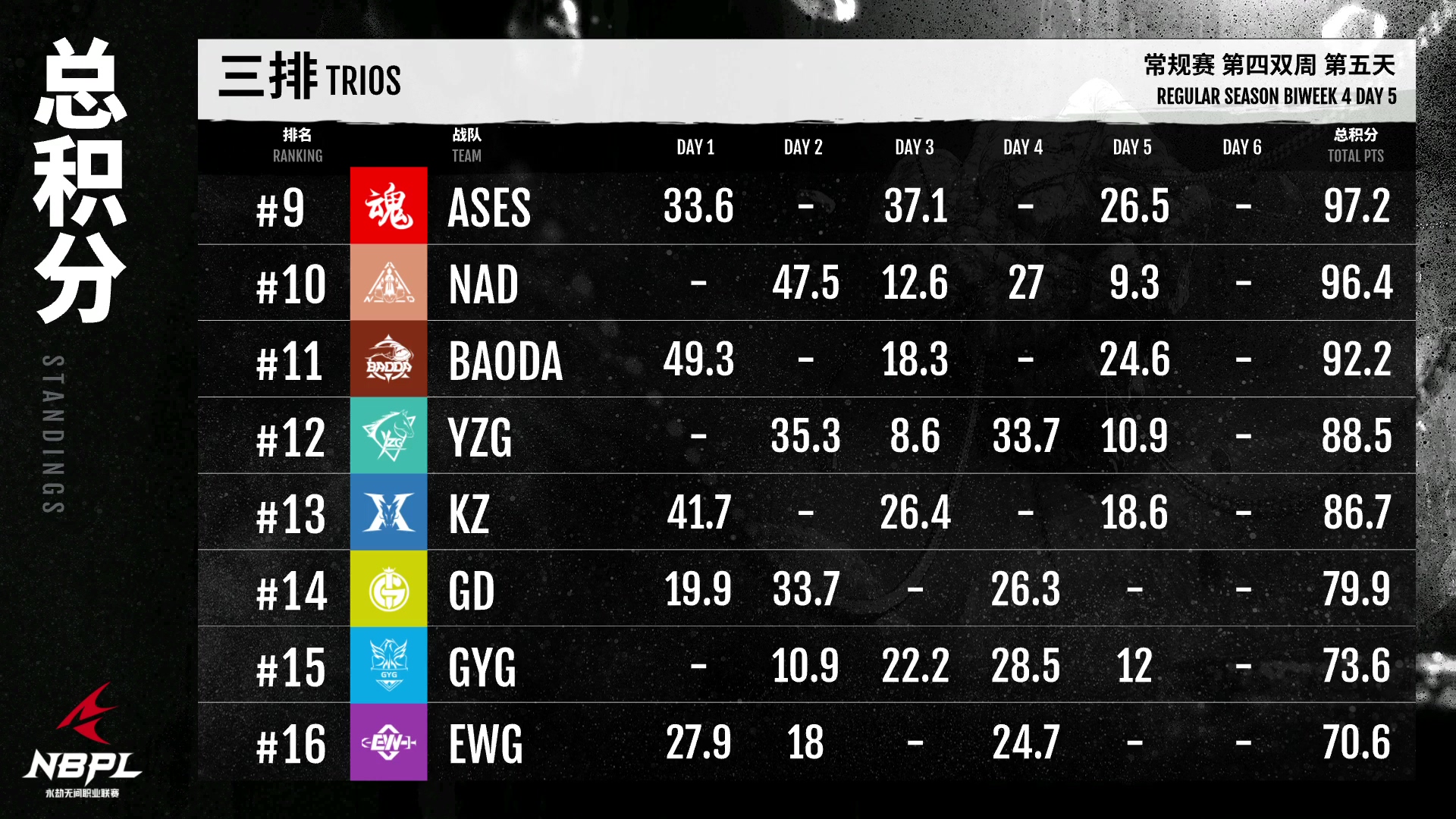 第三排,XCGaming电竞俱乐部保持了上周的状态,今天发挥不错!榜首,带着大量积分稳步进入周决策!GG队日最后一个大分局打得很完美,配合默契。他们的状态一直比较稳定,值得各位侠客关注!AOW这周很努力,一直坚持自己的阵容,而且越来越勇敢,打得特别好!