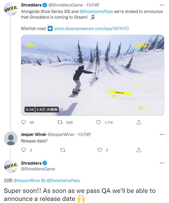 由于日期之间的差距很小,一些人怀疑Xbox页面比Twitter更新得更早。不过《Shredders》官方推文只是在今天(1月27日)更新了顶部推文,并没有具体说明游戏的发布日期,只是表示游戏会登录Steam,在评论区被问及发布日期时,《Shredders》官方推文表示:“很快!一旦QA通过,我们就可以宣布发布日期。”
