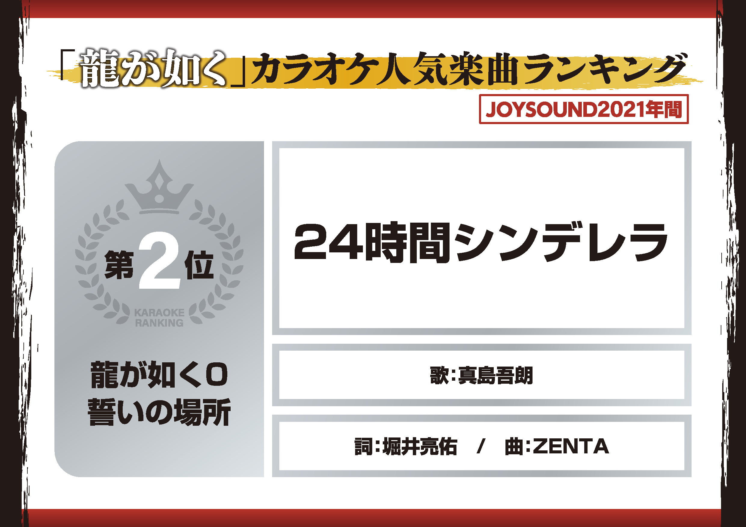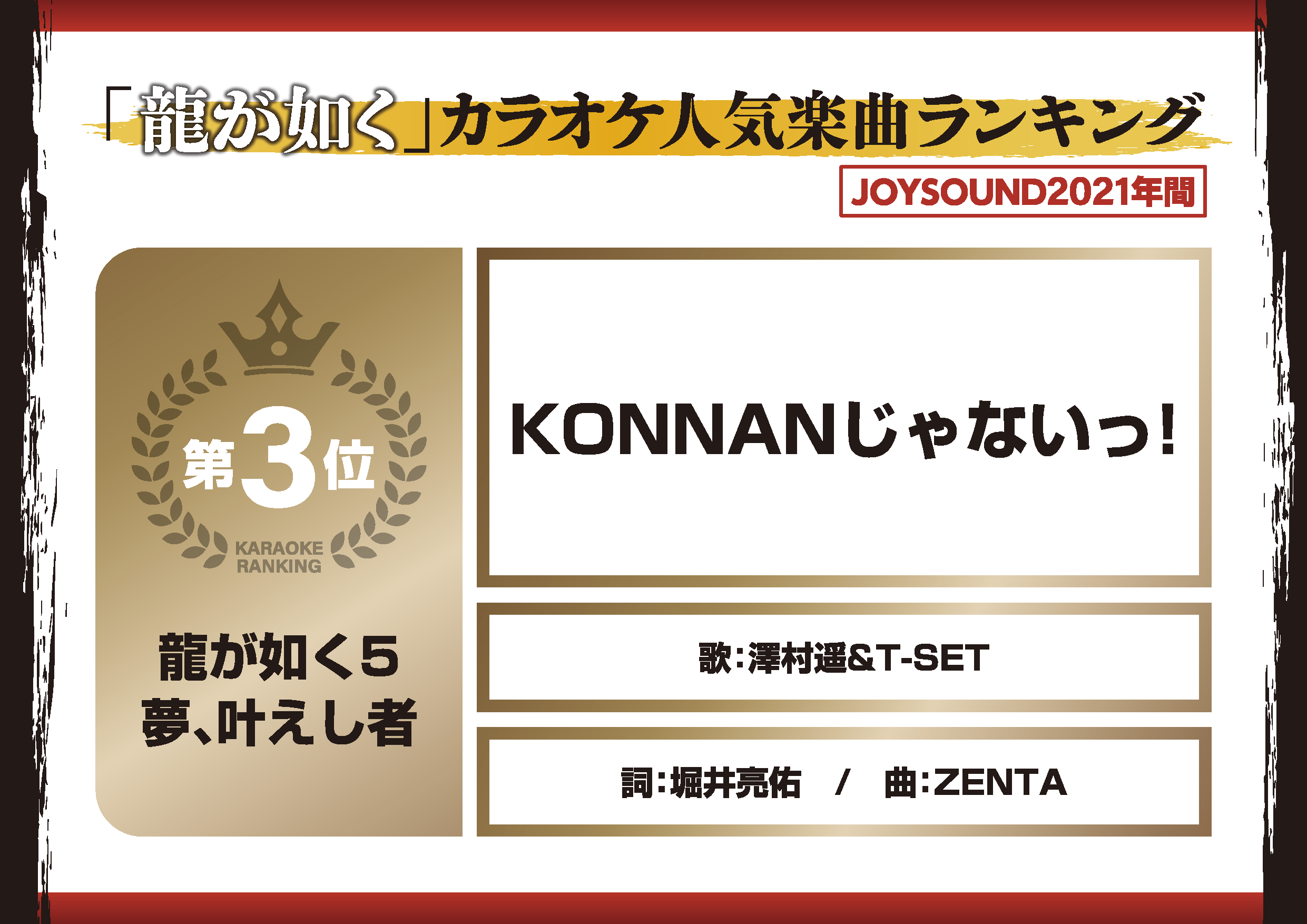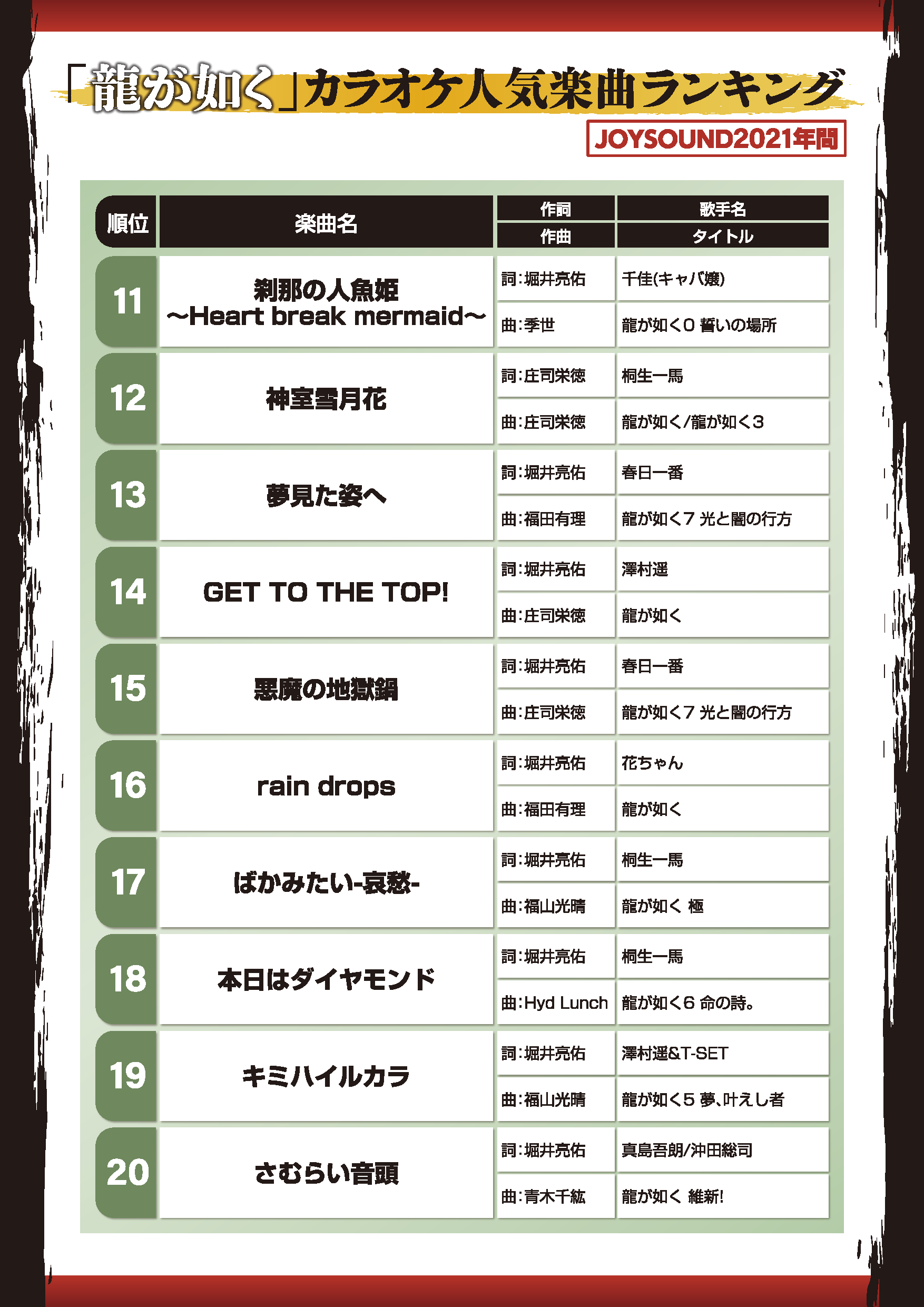 近日,《如龙》正式公布了2021年《如龙》系列热门卡拉ok歌曲排名。第一名是来自小岛康誉河的《像笨蛋一样》,第二名是新岛武郎的《24小时仙度瑞拉》,第三名是泽村耀和T-SET的《不该是这样!》。