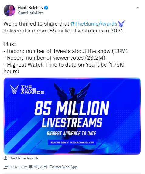 TGA创始人兼主持人Geoff Keighley在推特上表示,TGA2021颁奖典礼收视率再创新高,现场观众人数达到8500万人,比去年增长14%。 (2020年的现场观众人数为4500万人,2020年为8300万人)。 另外,今年TGA相关话题的推文数为160万条,观众投票数为2320万人,在YouTube的收看时间达到175万小时,都创下了TGA史上的新记录。