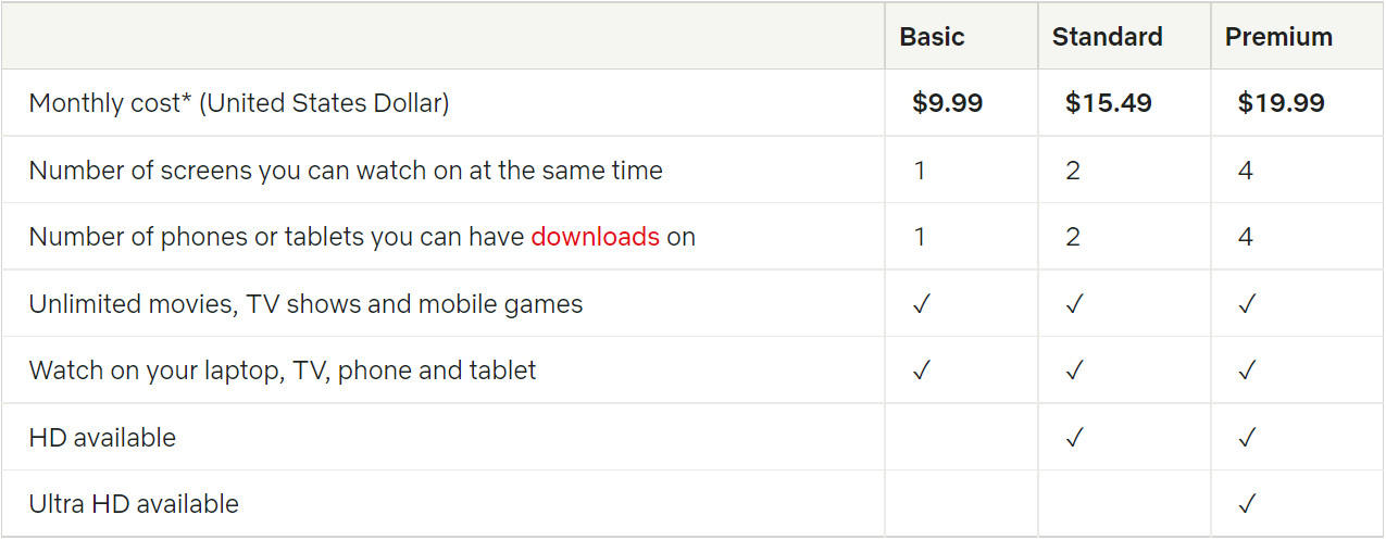 网飞在官网更新了官方定价时间表,反映标准版增加1美元,高级版增加2美元,后者支持4K流媒体。新的月费是: