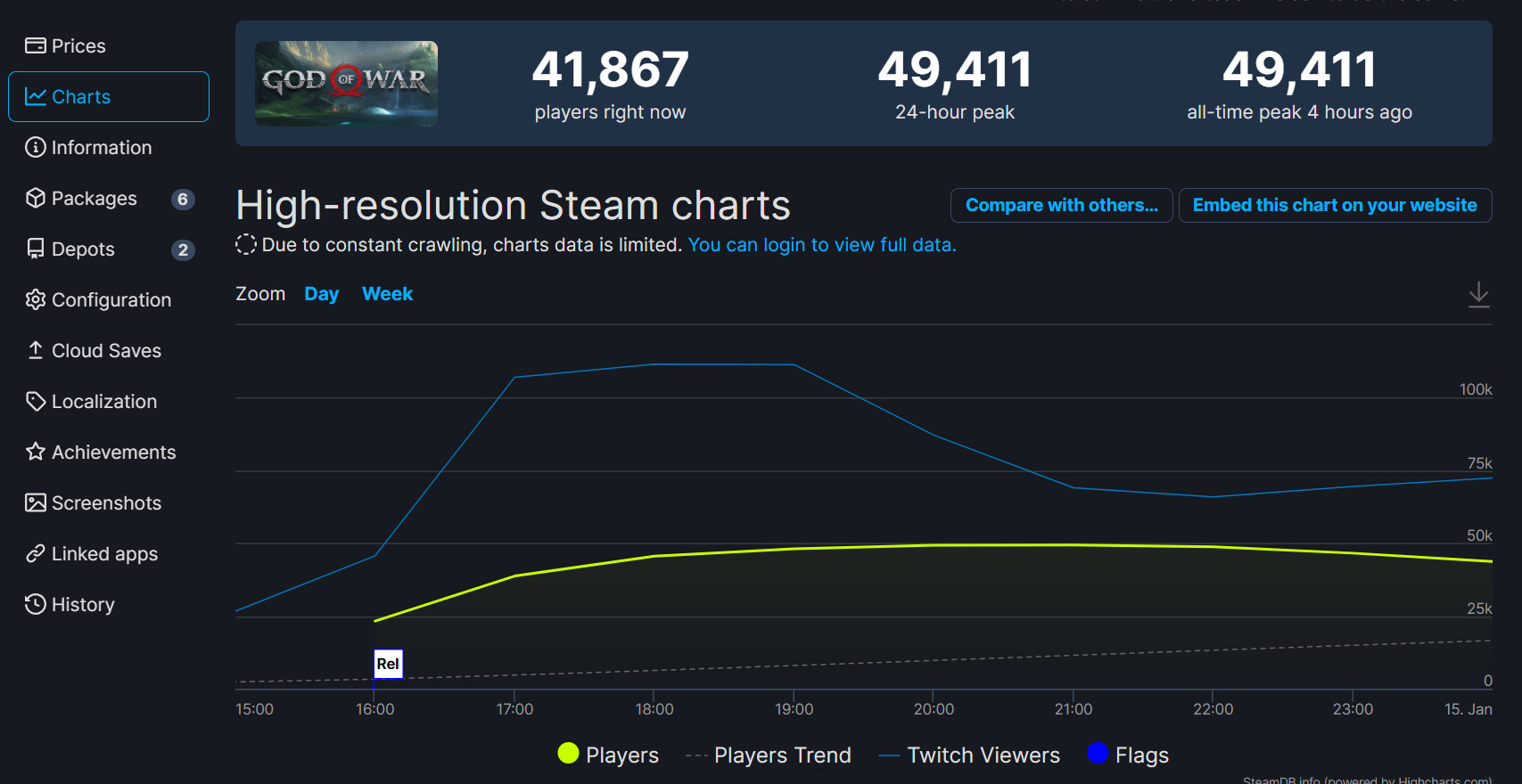《战神4》今天解锁,正式登陆Steam平台。根据SteamDB的统计,解锁几个小时后,在线玩家数量达到了49411人。不过这个数字并没有超过登陆Steam的另一款索尼第一方游戏:《地平线:零之曙光》,其最高在线玩家为56557。