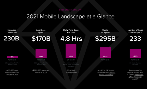 此外,2021年移动应用用户支出达到1700亿美元,同比增长19%,下载量继续以5%的速度同比增长,达到2300亿次。