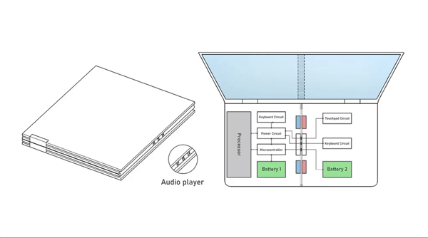 从专利图来看,分成两半的键盘都有自己的电池和输入电源,其中一半还有一套处理器和微控制器。这种设计使得这款折叠屏笔记本在完全折叠后,只有其展开尺寸的四分之一。