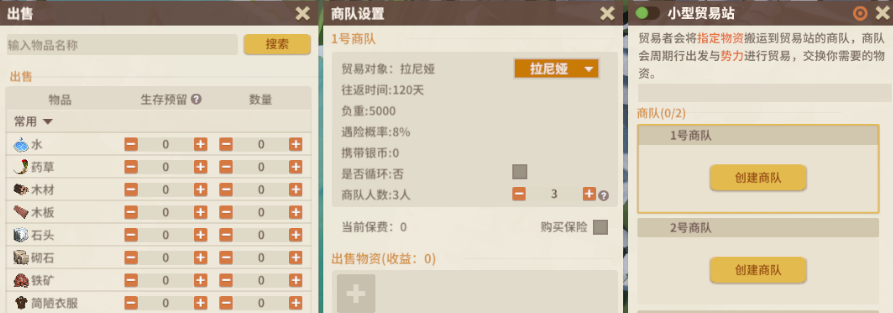 与以前相比,你可能需要花更多的时间来设定贸易目标和实施贸易大篷车。但是,这些设置完成后,大篷车可以根据您的设置定期买卖商品。现在玩家可以真正实现集中发展优势产业换取稀缺物资的循环,希望这样可以丰富游戏的发展选择,避免玩家必须自己生产所有物资或者高价订购物资的尴尬。