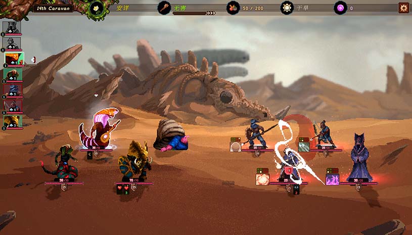 新游戏伊始,你可以招募四名角色组成驼队,领导他们穿越不断变化的自然环境,达成目标。每个角色的职责和技能各不相同,会显著影响游戏过程。是化身考古学家,探索失落的遗迹,还是化身猎人,追踪巨兽,由你选择。