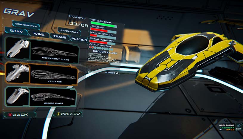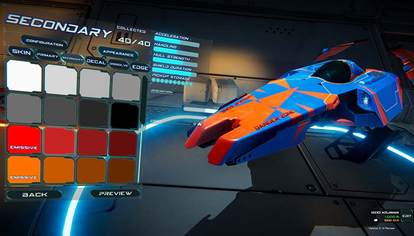 自定义你的重力赛车(Grav),随心所欲,但请明智地选择:决定一项升级可能代表得放弃另一项升级。以战略为主来订制你的重力赛车,可在比赛中或局势堪虑时占得上风。除了自定义的选项以外,可解锁的皮肤将免费提供。