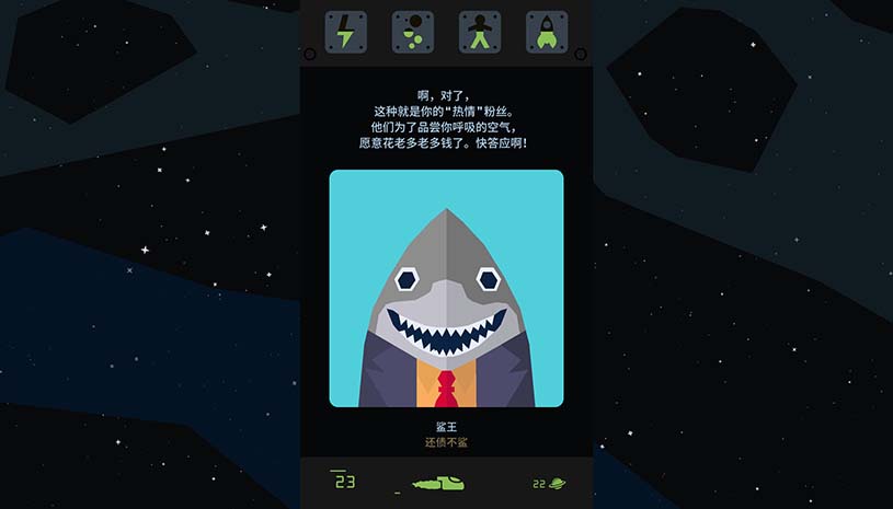 解锁60+性格迥异的角色,其中包括你的经理人鲨王、软体动物学者斯特隆博、太空战熊格朗……当然还有你才华横溢的乐手们还有无所不知的飞船内置人工智能。