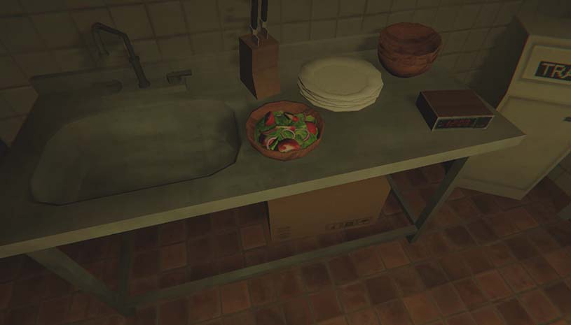 你的职责是准备菜品,并通过亭子的窗户为顾客提供服务。用菜刀准备好食材,或是在亭中的烧烤台上烤肉。顾客们有时也会想要喝点东西,所以你得为他们准备好汽水与啤酒。你偶尔还需要在咖啡机上为他们煮上一杯热腾腾的咖啡。