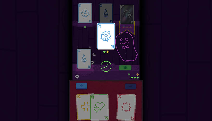 《Heck Deck》5道关卡各不相同,弹幕射击挑战你的手眼协调,使用卡牌则考验你的策略谋划。每挑选一张卡牌,都会耗费你至少一点生命,因而挑选有必要慎重。