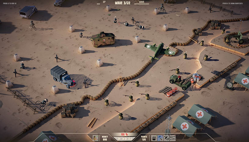 游戏涵盖68个关卡,4个被动技能,4个主动技能。你可以在每一轮选择不同的部队类型。