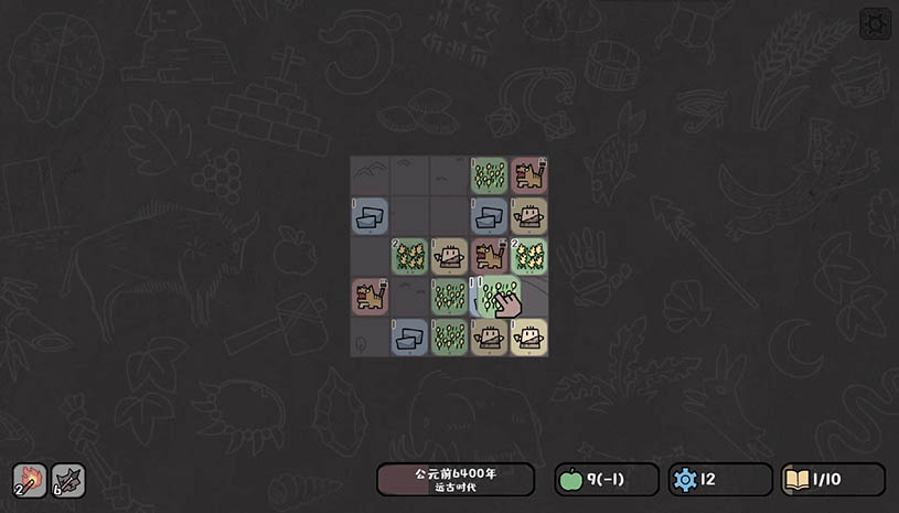 拖动三个相同地块放到一起,便能搜集资源。食物维持文明的生存。
