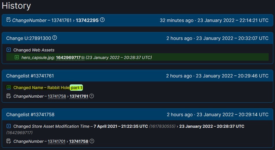 通过SteamDB查询,可以发现《兔窟镇》的原英文名称今天早上从《Rabbit Hole》改成了《Rabbit Hole part 1》。看来开发者们显然已经做好了连载《兔窟镇》游戏作品的准备,预计只有这个系列游戏的第一款游戏,或者说“第一章”故事,才会在6月份发布。