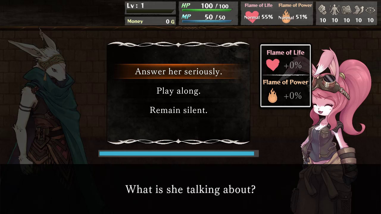 在游戏中,根据玩家的选择,主角的【坚持】和性格想法也会相应改变。游戏的结局也会随着冒险中生命的使用而改变。