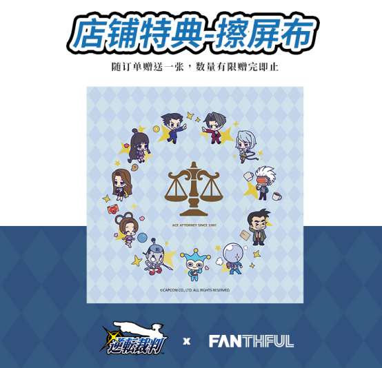 如果您立即在FANTHFUL官方渠道购买,将有机会获得《逆转裁判》限量特别版——字符Q版主题擦布。详情请咨询具体销售店铺(数量有限,库存最后!)