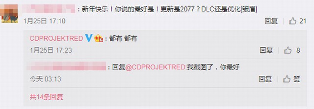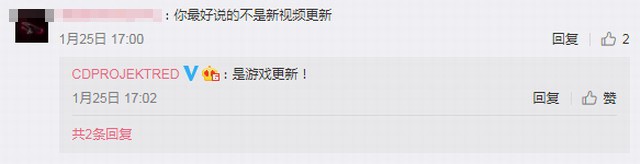 评论区有玩家问官方这次更新是指《赛博朋克2077》的更新,DLC还是优化更新。官方回复说:“都有,都有”。别人不放心继续问,你确定是游戏更新而不是视频更新?正式来说,这是一个游戏更新。