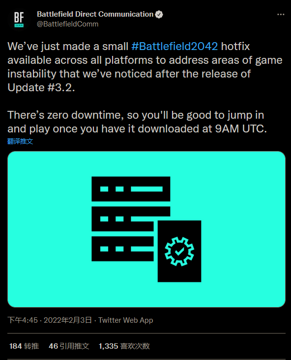 《战地》官方在推特上表示:“我们今天补丁之后的下一次更新现在将在3月初推出,这是我们上次给大家的预期发布信息的变化。额外的时间将有助于确保我们能够提高更新的质量,并包括额外的更改。”