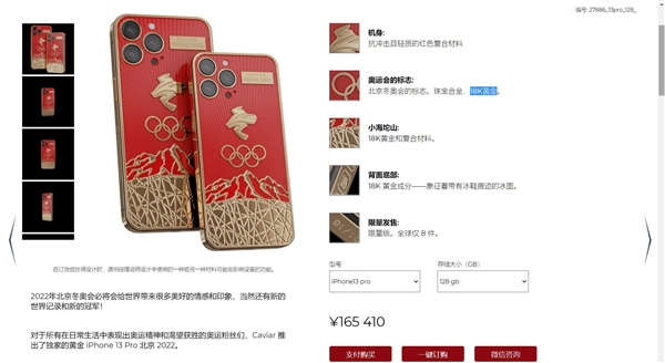 2月4日,北京冬奥会将于今天2033.6万正式开幕。在这个特殊的时刻,如知名珠宝商Caviar用18K黄金打造了iPhone 13、iPhone 13 Pro Max两款旗舰。,图所示,鱼子酱制造的iPhone 13 Pro系列采用抗冲击、轻质的红色复合材料,背面印有北京冬奥会标志。