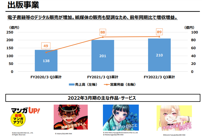 2022财年最新的第三季度,施威尔艾尼克斯总销售收入达到2736亿日元,较去年同期的2536亿日元增长7.9%,营业利润为501亿日元,较去年同期增长22.2%,其中净利润达到398亿日元,较去年同期增长116%。