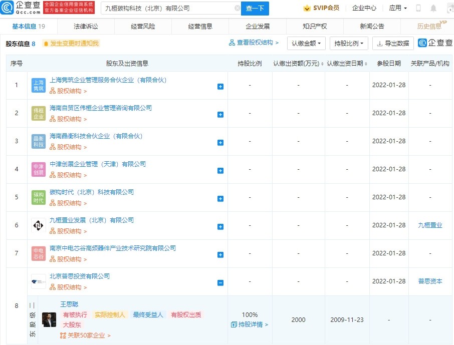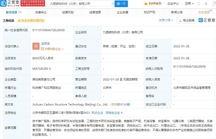 近日,公司查APP显示,1月28日,九源碳结构科技(北京)有限公司成立,于玉泽为法定代表人,注册资本8000万元。