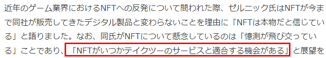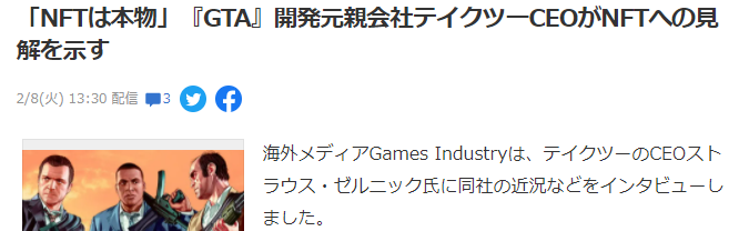 近日有业内人士表示,目前的NFT是骗局(本网站报道),老牌游戏工厂Take-Two CEO Strauss zel nick在最近的一次采访中表达了对NFT的期待,称NFT是真实存在的,未来有机会Take-Two会介入服务。