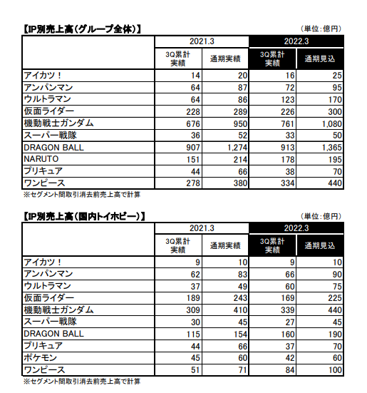 在在IP方面,的全球销售额中,《龙珠》以907亿日元排名第一,其次是《机动战士高达》(676亿日元),《海贼王》以278亿日元排名第三,《假面骑士》以228亿日元排名第四。在日本的IP销售额中,《机动战士高达》以309亿日元排名第一,《假面骑士》排名第二(189亿日元),《龙珠》排名第三(115亿日元)。