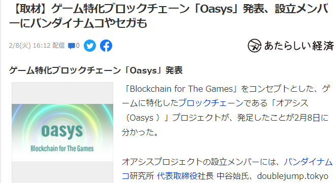 紧跟时代潮流,2月8日,今天,增强游戏新区块链《Oasys》在日本正式成立,包括万代研究院院长、世嘉副总裁在内的众多游戏行业高管参与策划创作,敬请关注。