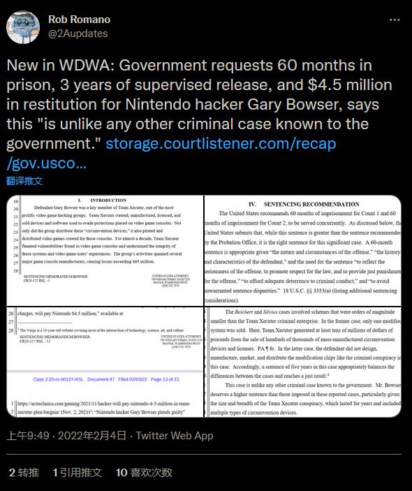 10月份,黑客加里布瑟输掉了一场针对任天堂的官司。此前,任天堂追他是因为他参与的黑客组织Team Xecuter。该组织以制造、推广和销售大量游戏机改装芯片以及开发越狱软件而闻名。加里布瑟被控犯有两项罪行,即“共谋逃避技术措施”和“贩运以逃避设备”,面临10年监禁。