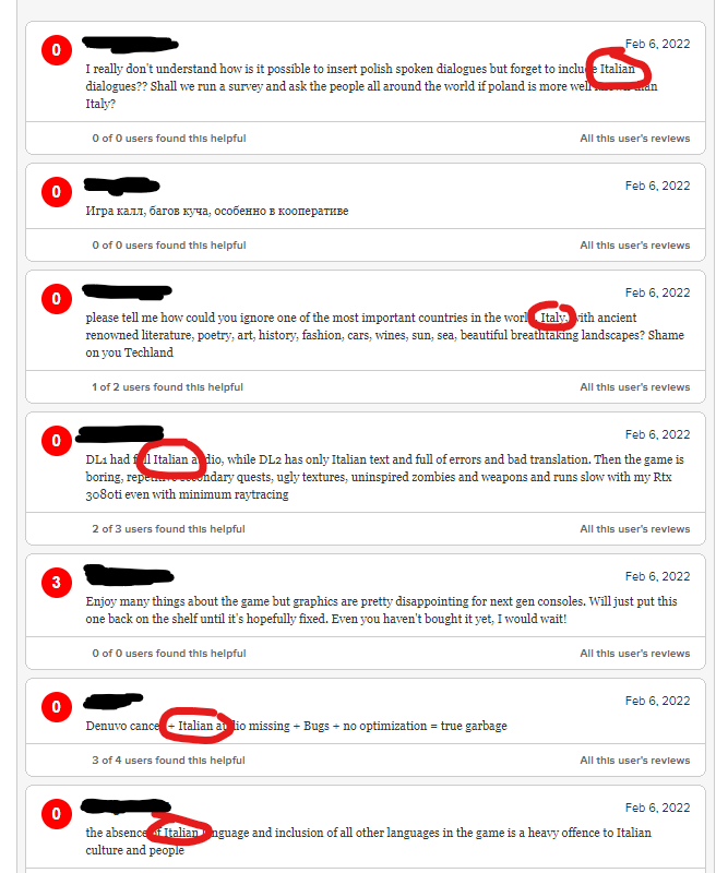 一条愤怒的评论写道:“游戏中没有意大利语,却包含了所有其他语言,这是对意大利文化和人民的严重冒犯。”和“ 《消逝的光芒2》 只有意大利字幕,有很多错误和糟糕的翻译。”。另一人补充道:“他们不尊重意大利和意大利人。我们意大利人是不会尊重他们的。”