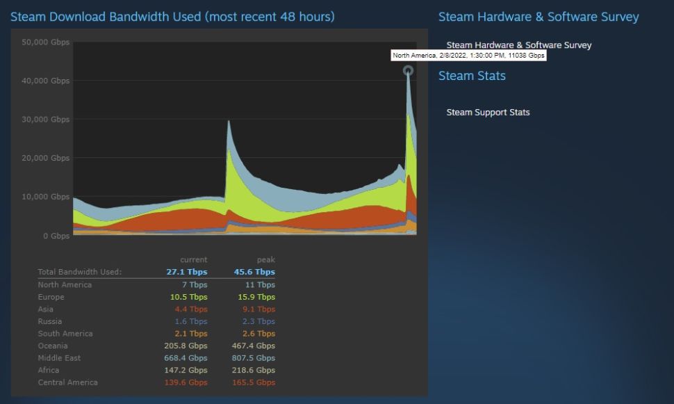 就像《光环:无限》和《新世界》发布的时候一样,Steam再一次报道下载流量飙升是因为太多玩家开启了游戏的预装。《光环:无限》免费多人模式突然上线后,峰值带宽达到23.5 Tbps,而《失落的方舟》预发布期间,峰值带宽达到30 Tbps。