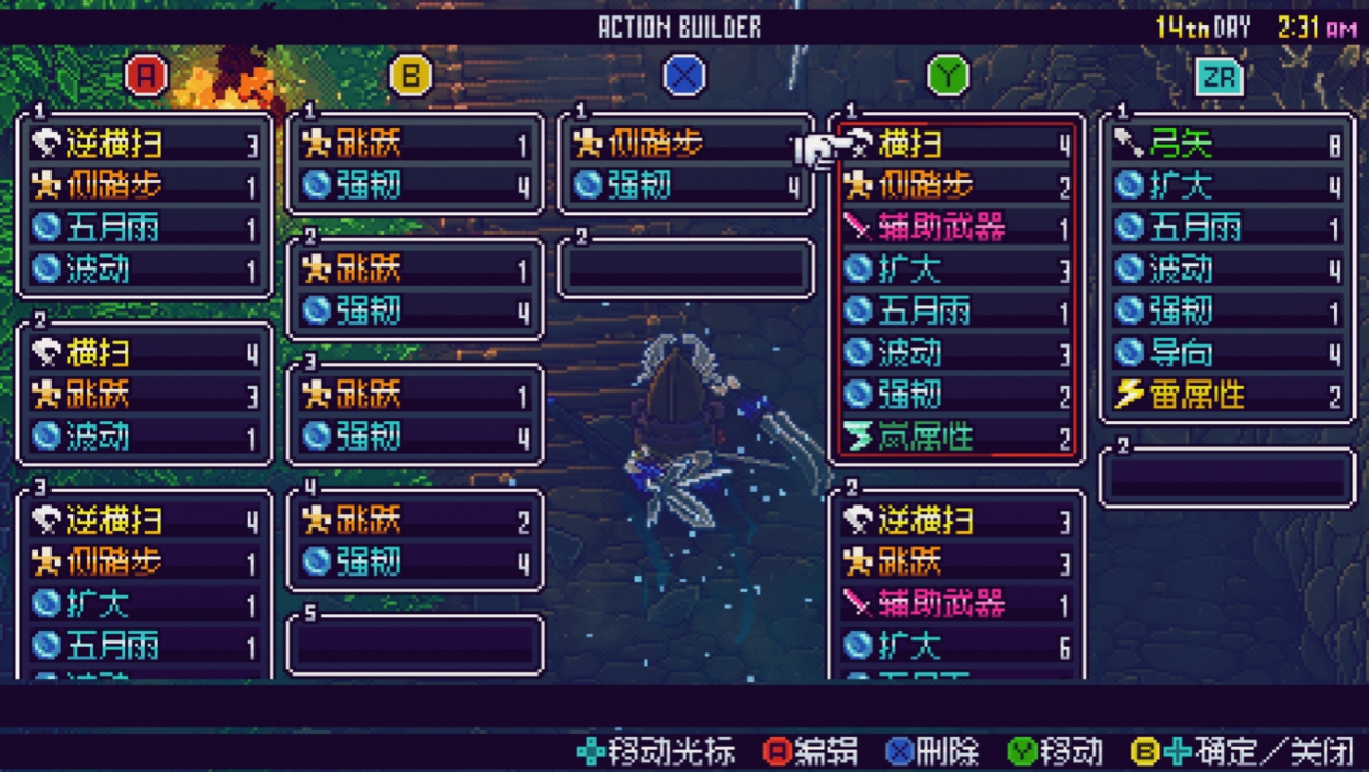 除了“1 1 1=3”的技能组合模式外,本作很多独特技能的完成需要满足卷轴类型、组合数量、角色装备等各种条件。如果只凭自己的想象去尝试,你很难把那些特殊技能和很酷的独立模块结合起来。虽然玩家在准备复活时可以向其他武将学习技能,但这也意味着玩家必须放弃当前的游戏进度,这在逻辑上有些矛盾。