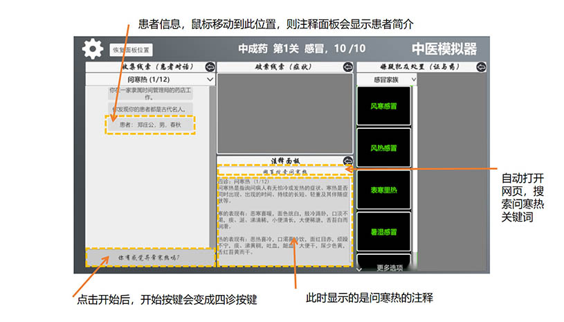 游戏中带有许多注释,把握好规则,游戏的核心是辨证;首要四诊得到症状和体征,这一步比较简单,然后点击右侧各个证(病),注释面板会出现该证(病)的解说,需要看注释面板的内容,这样能大概比较出哪个证(病)和现在的症状更符合,不能完全确定也没关系,点击右侧的证候剖析,