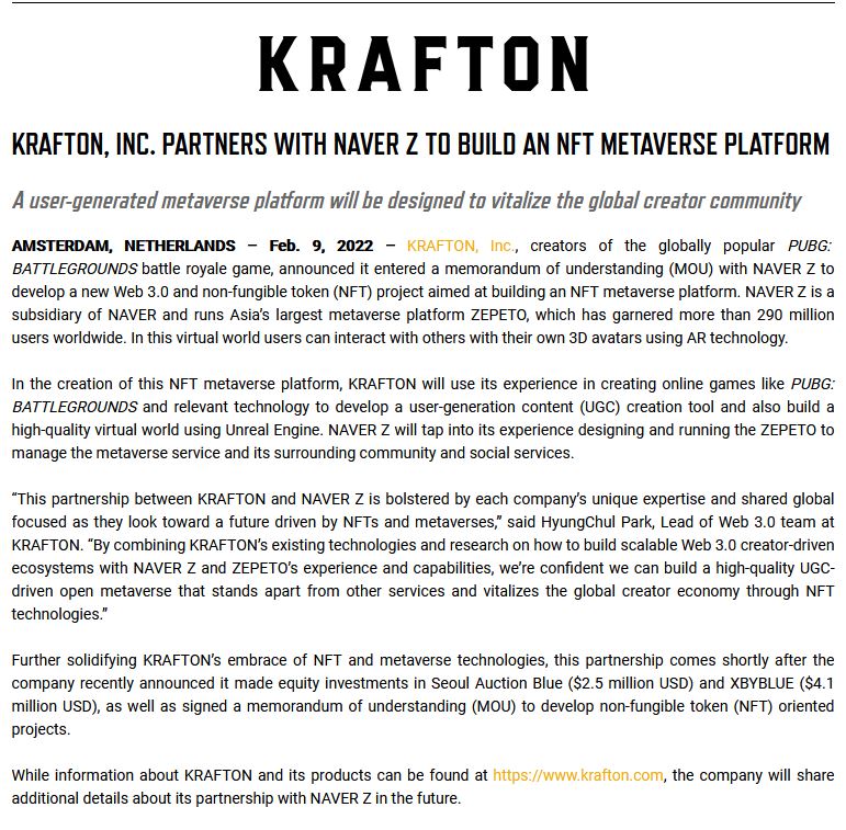 即便最近许多游戏公司 NFT 项目的公告都受到了玩家的强烈反对,《PUBG》开发工作室 Krafton 依然宣布它即将开发一款 NFT 游戏。该公司已与元界平台 Zepeto 的运营商 Naver Z 签署了一项协议,“开发一个新的 Web 3.0 和NFT 项目,旨在构建一个 NFT 元宇宙平台。” ...