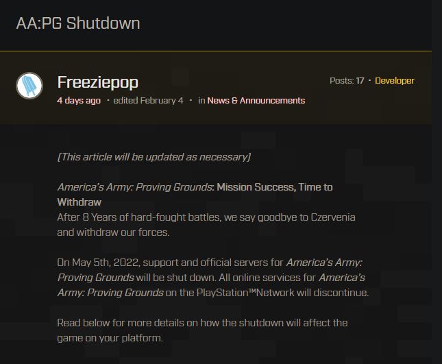 在长达 20 年的运营后,《美国陆军》游戏即将关服。在官方论坛上,美国陆军表示,游戏《美国陆军:试验场》的所有支持和官方服务器,以及当前版本游戏,将于 5 月 5 日关闭。 ...